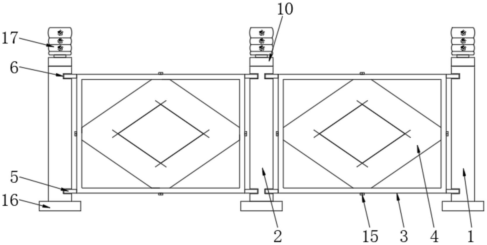 本实用新型涉及围栏技术领域,尤其涉及一种雕花艺术围栏,包括边立柱和中间立柱,所述边立柱和中间立柱相靠近的一侧之间设置有栏板安装框架,并且栏板安装框架的内侧设置有雕花板,所述栏板安装框架两侧的顶部和底部均固定连接有耳板。本实用新型通过边立柱和中间立柱,边立柱和中间立柱相靠近的一侧之间设置有栏板安装框架,并且栏板安装框架的内侧设置有雕花板,栏板安装框架两侧的顶部和底部均固定连接有耳板,相比现有焊接或简单螺栓固定的连接方式,能够实现围栏的方便便捷拆装操作,除边立柱和中间立柱的施工外无需借助工具,操作简便,有助于围栏施工的时间缩短,提高施工和维护效率,节省人力。
