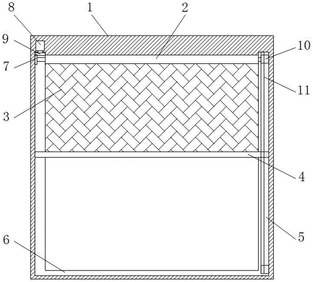本实用新型公开了一种带有防尘功能的降噪型窗帘,包括窗帘安装框,窗帘安装框通过紧固件安装在窗台上,窗帘安装框的内框顶端设置有顶槽,且窗帘安装框的内框两端均设置有滑槽,顶槽内横跨安装有窗帘滚轴,且窗帘滚轴的下端设置有窗帘本体,有窗帘本体的底端安装有可拆卸的窗帘板,窗帘安装框的内框底端设置有底槽,窗帘滚轴的一端固定设置有从动齿轮,且窗帘滚轴的另一端固定设置有皮带轮。有益效果:通过设置的声音传感器和电机以及智能降噪发声模块相互配合,在外界声音达到一定分贝时,被动降噪;当声音传感器感应到外界声音达到再一预设值时,实现主动降噪;通过设置的导静电纱网,使得其具有防尘功能,防止尘土进入到内部。
