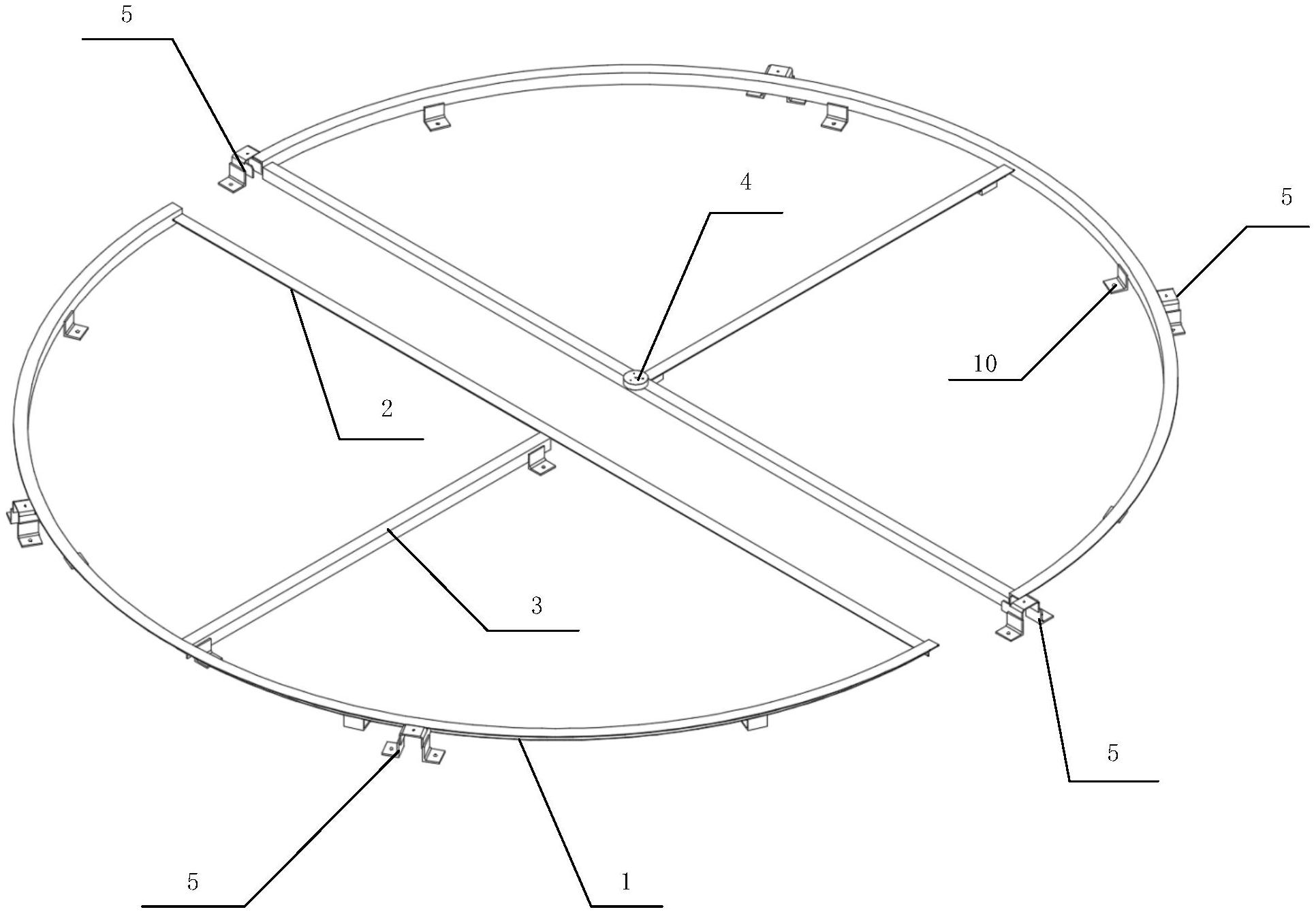 本实用新型提供一种组合式旋转门地圈结构,属于旋转门制造领域;本实用新型包括:两个半圆形组件;两个所述半圆形组件相连,以组成圆形结构;每个所述半圆形组件包括:半圆轨道、横杆和支撑杆;所述半圆轨道的端部均固定在所述横杆的两端;所述支撑杆的一端垂直固定在所述横杆的中部,另一端与所述半圆轨道的中部相连;两个所述半圆轨道依次相连,以组成圆环形轨道。本实用新型的地圈结构,两个半圆形组件可以预先在工厂制造,不仅便于批量化降低成本,也能够便于整体强度和制造精度;安装时只需要拼接两个半圆形组件即可,大幅度方便了安装。