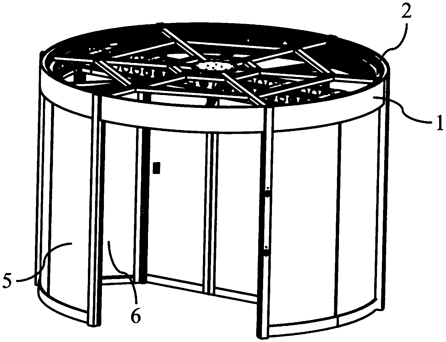 本实用新型提供了一种旋转自动门的顶框结构,包括圆环形且设置为同心的外框和内框。外框具有圆形轨道,外框与旋转自动门的固定门扇连接;内框上具有滚轮,内框与旋转自动门的旋转门扇连接;滚轮可在外框的圆形轨道中滚动并沿圆形轨道作圆周运动。本实用新型的旋转自动门的顶框,由于采用了内框和外框分离的结构,使得其装配更加简便,且更加安全可靠。