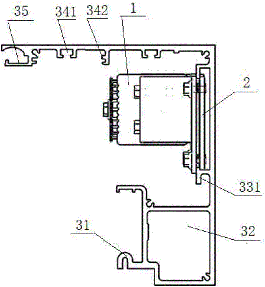 自动平移门电机载装通用导轨梁,导轨梁(3)为角铝型材结构,在竖立侧壁底沿有底梁(32),沿底梁(32)内侧有上凸的滑轨(31);在底梁(32)上侧的竖立侧壁内侧设置立壁安装座(33),在顶面内测向下设置顶悬挂安装座(34);电机固定板(2)以螺钉紧固安装在立壁安装座(33)或顶悬挂安装座(34)中。增加多种电机的安装固定方式,使导轨梁可安装多种电机,有效提升导轨梁的通用性,保证多个型号的电机可以安装在同一种规格的导轨梁上。增强导轨梁通用性,使多款电机均可顺利安装在导轨梁上,节省安装时间,快捷方便,降低制造和维护成本,拓宽自动平移门产品细分市场。