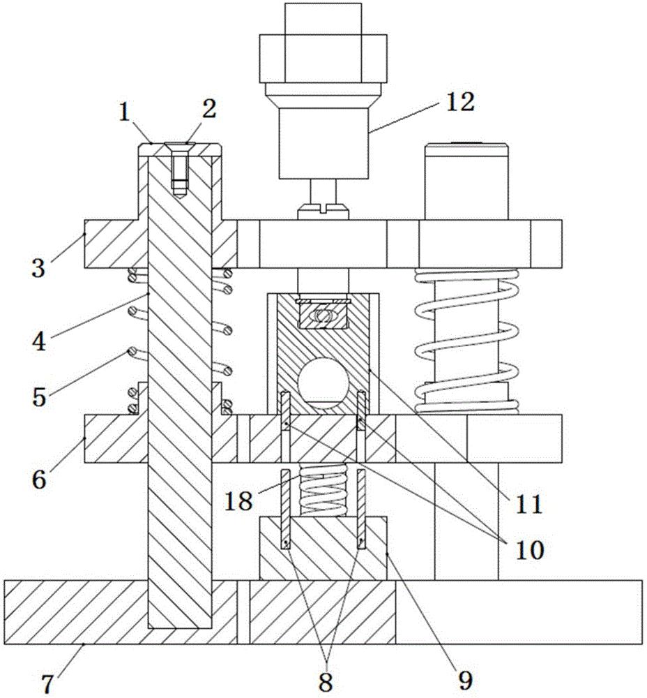 现有卡簧压入装置功能单一,只能实现卡簧压入功能,如需对销子进行压入,需要额外的销子压入装置,组装工件时首先用卡簧压入装置将卡簧压入;其次,再用销子压入装置将销子压入,这就使得操作时间长,生产效率低。本实用新型提出一种多功能卡簧压入装置,包括上板,中间板和底板,底板中部有两个用于安装顶针的安装孔,底板两侧对称的固定有支柱,支柱的上部位置设有上板,上板上带有开孔,上板和底板之间设有中间板,上板和中间板通过第一弹簧连接,中间板和底板之间还设有第三弹簧,中间板的中部有第一凸台和用于放置销子的安装孔。所述卡簧压入装置还包括联动杆,所述联动杆一端连接在上板上,另一端穿过中间板上的开孔。