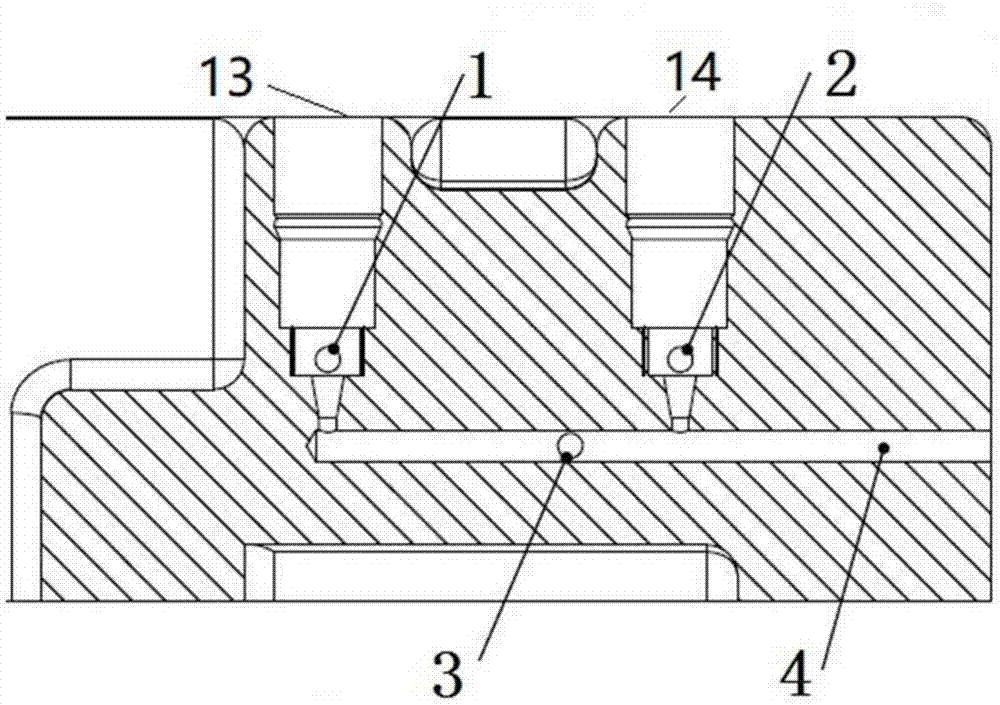 地弹簧是一种液压式闭门器,地弹簧的结构设计和加工精度直接影响地弹簧的使用寿命。本实用新型提出了一种地弹簧,包括活塞、调节阀和外壳,其特征在于,活塞将外壳内部分为第一油腔和第二油腔,外壳内有主油路、副油路一、副油路二和副油路三,副油路三的上方有第一孔,副油路一的上方有第二孔,副油路三与第一油腔和主油路相通,副油路一与第二油腔和主油路相通,副油路二与第一油腔和主油路相通。所述活塞包括第一O型圈和密封环,第一O型圈装在活塞沟槽内侧,第一O型圈的外侧装有密封环。所述调节阀包括阀体和阀芯,阀体上装有第二O型圈和止动环。阀体材料采用金属。阀芯材料采用塑料。