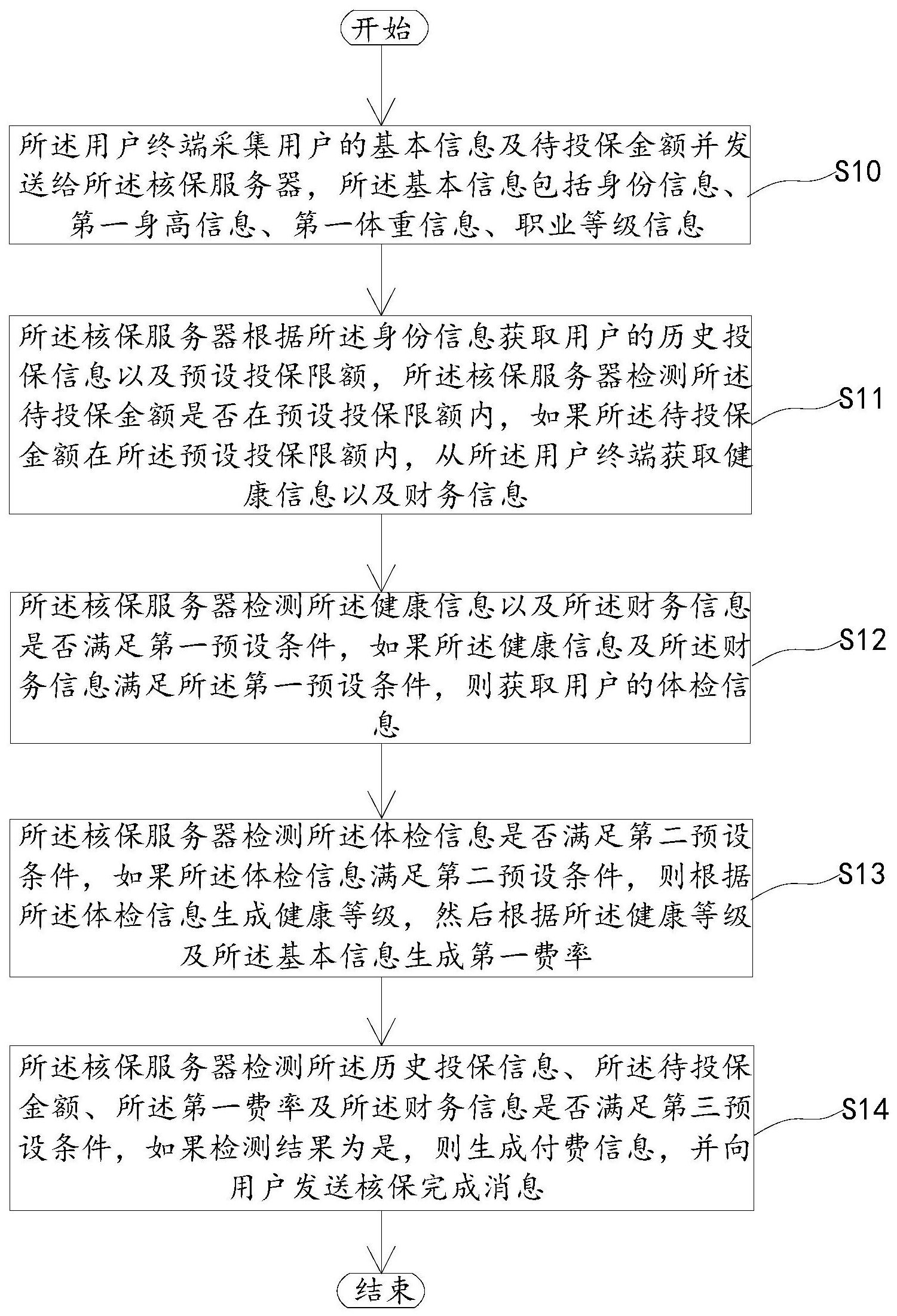 本申请公开了一种核保方法及核保系统,核保方法包括:用户终端采集包括身份信息的用户基本信息及待投保金额并发送给核保服务器;核保服务器根据身份信息获取用户的历史投保信息以及预设投保限额,当待投保金额在预设投保限额内时,从用户终端获取健康信息以及财务信息;核保服务器检测到健康信息及财务信息满足第一预设条件,则获取用户的体检信息;核保服务器检测到体检信息满足第二预设条件,则根据体检信息生成健康等级,然后根据健康等级及基本信息生成第一费率;核保服务器检测到历史投保信息、待投保金额、第一费率及财务信息是否满足第三预设条件,则生成付费信息,并向用户发送核保完成消息。本申请所述方案具有核保效率高的特点。
