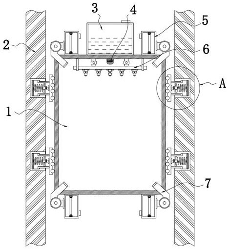 本实用新型公开了一种隔震电梯,包括电梯轿厢、电梯井框架、受压板和预留槽,所述电梯轿厢的两侧均设置有电梯井框架,且所述电梯井框架靠近电梯轿厢的一侧均匀开设有预留槽,所述预留槽的内部均通过刚性弹簧设置有活动件,且所述活动件靠近电梯井框架的一侧均固定有受压板,所述受压板靠近电梯井框架的一侧均匀分布有导向滚珠,所述电梯井框架内部的顶端设置有烟雾传感器,且所述烟雾传感器下方的电梯井框架内通过支架固定有喷淋管。本实用新型通过安装有电梯轿厢、电梯井框架、预留槽、刚性弹簧、受压板、导向滚珠以及活动件,起到隔震的作用,防止因震动传递导致相邻的墙体内产生噪音,对住户的生活环境产生影响。