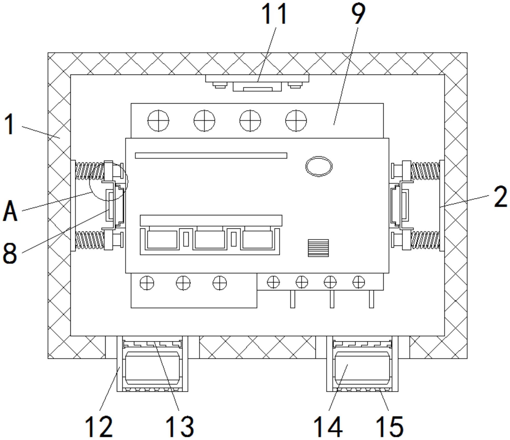 本实用涉及太阳能热水器技术领域,且公开了一种太阳能热水器过电保护装置,包括箱体和过电保护器本体,所述箱体的左右两侧壁均固定安装有安装板,两个所述安装板的相对一侧均固定安装有两个固定杆,所述固定杆的外侧滑动连接有滑块,左右两侧相对应的两个所述滑块相背的一侧均固定安装有伸缩弹簧,顶部与底部相对应的两个所述滑块相对一侧之间固定安装有连接块,两个所述连接块相对的一侧均固定安装有卡块。该太阳能热水器过电保护装置,拆装过程简单方便,省时省力,可对箱体内进行加热除湿,防止潮湿的空气给过电保护器本体造成较大的影响,有效的保证了过电保护器本体的正常使用,从而便于对其进行使用。