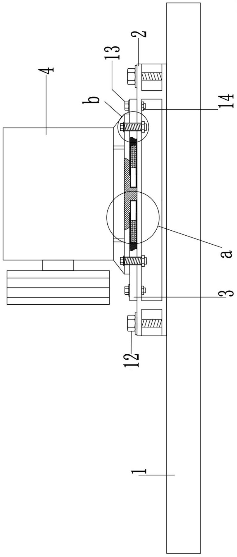 本实用新型公开了一种电梯曳引机固定装置,包括承重梁、支撑钢板、固定板以及曳引机,所述支撑钢板固定安装在承重梁上方,所述固定板固定安装在支撑钢板上方,所述曳引机安装在固定板上方,所述曳引机和固定板设有辅助固定结构;所述辅助固定结构,包括:空腔、一对弹簧、一对限位卡块、凸块以及一对限位卡槽;涉及电梯曳引机固定装置的技术领域,本实用新型旨在解决现有的电梯曳引机都是通过螺栓之间进行连接,不具备限位连接的功能,使得螺栓连接的时候,螺纹孔无法对其,从而加大固定的难度,降低安装的效率的问题。