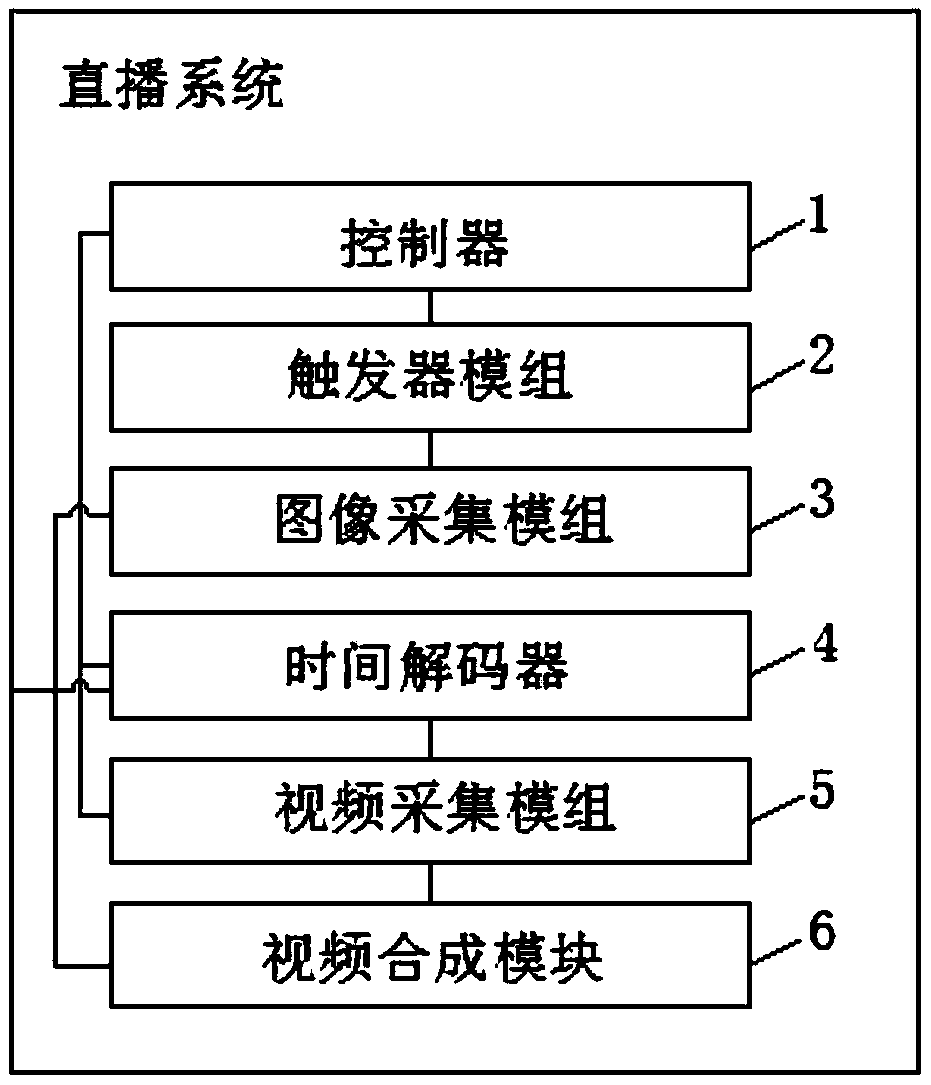 本实用新型公开了一种直播系统,包括:控制器,所述控制器为单片机;触发器模组,连接所述控制器,包括多个触发器;图像采集模组,连接所述触发器模组,包括围绕预定拍摄目标以预定拍照位置安装的多个相机;视频采集模组,连接所述控制器,包括围绕所述预定拍摄目标以预定拍摄位置安装的首摄像机和尾摄像机。本实用新型有益效果:以相机拍摄照片序列工具,与首尾摄像机视频连接,实现360度环绕拍摄,由常用图像视频编辑软件最终形成起始视频、相机照片序列和末尾视频相衔接的完整的直播视频并输出。