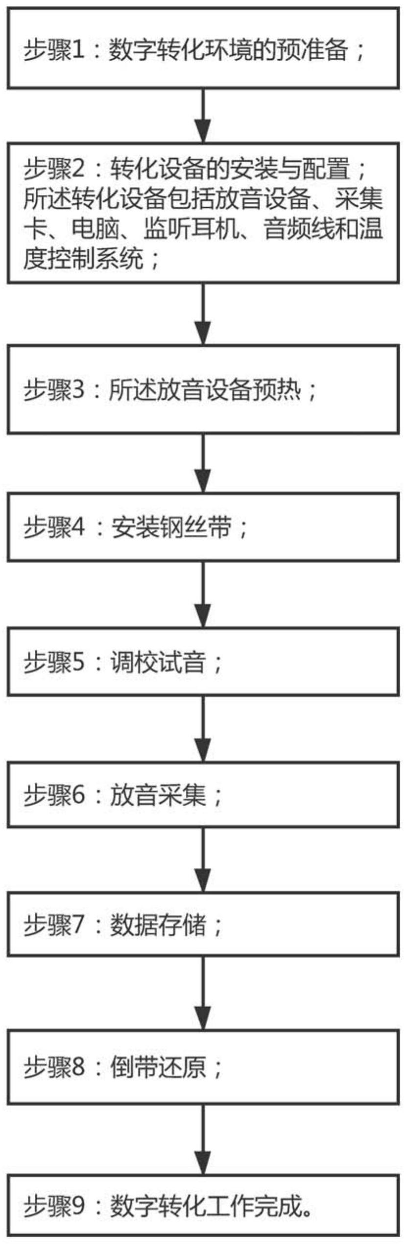 本发明公开了一种对钢丝录音进行数字转化的方法,涉及钢丝录音数字转化领域,包括如下步骤:步骤1:数字转化环境的预准备;步骤2:转化设备的安装与配置;步骤3:所述放音设备预热;步骤4:安装钢丝带;步骤5:调校试音;步骤6:放音采集;步骤7:数据存储;步骤8:倒带还原;步骤9:数字转化工作完成。本发明公开的对钢丝录音进行数字转化的方法,可以实现利用现有钢丝录音机对钢丝音频档案进行高效且高质量的数字化转化工作,极大地减少钢丝音频档案播放次数,最大限度保护现有钢丝音频档案;而且可以有效提高钢丝音频档案的音频模拟信号的信号采样值和电平振幅的数值的稳定性。