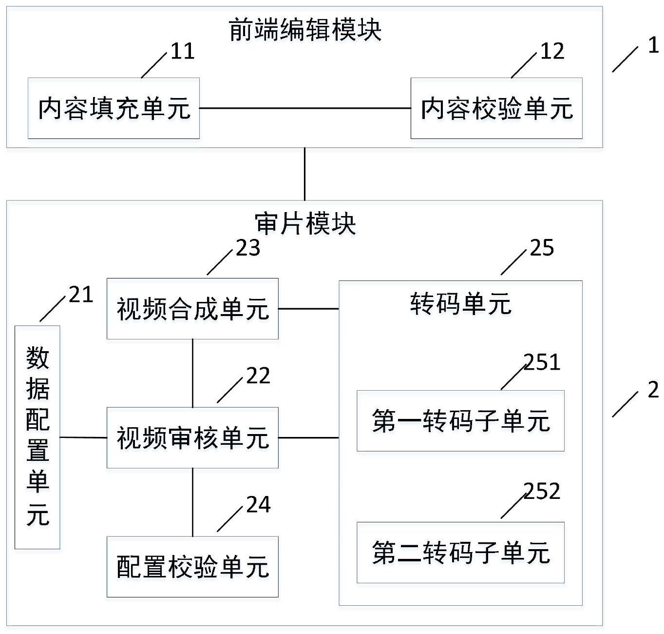 本发明提供一种视频节目审片系统及方法,涉及审片技术领域,包括:前端编辑模块,供编辑人员进行视频节目的编辑,并将编辑完成的视频文件送审;审片模块,用于向接收的视频文件配置一总资源编号;视频文件中存在至少一原始视频片段审核不通过时,向原始视频片段配置问题数据并反馈至前端编辑模块;编辑人员根据问题数据对原始视频片段进行修改得到配置有总资源编号的修改视频片段,并送审直至修改视频片段审核通过;在修改视频片段审核通过后,根据总资源编号匹配视频文件,并将原始视频片段替换为修改视频片段得到新视频文件,以完成视频节目审片。有益效果是有效提高整体视频节目生产修改效率,提高了用户体验度。