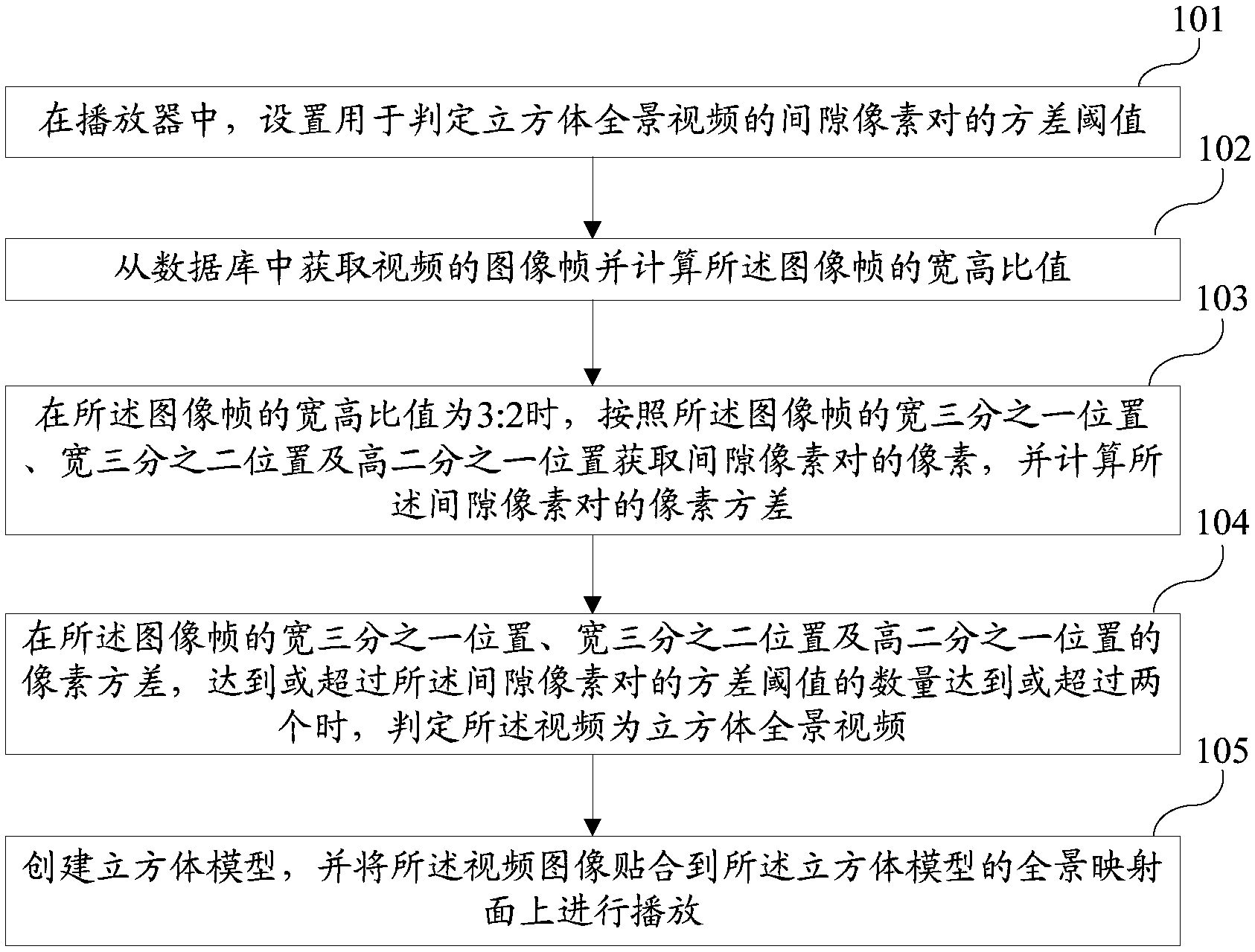 本发明公开一种自动识别立方体全景视频的方法,包括:在播放器中,设置用于判定立方体全景视频的间隙像素对的方差阈值;从数据库中获取视频的图像帧并计算所述图像帧的宽高比值;在所述图像帧的宽高比值为3:2时,按照所述图像帧的宽三分之一位置、宽三分之二位置及高二分之一位置获取间隙像素对的像素,并计算所述间隙像素对的像素方差;在所述图像帧的宽三分之一位置、宽三分之二位置及高二分之一位置的像素方差,达到或超过所述间隙像素对的方差阈值的数量达到或超过两个时,判定所述视频为立方体全景视频。本发明实现了立方体全景视频的自动识别。