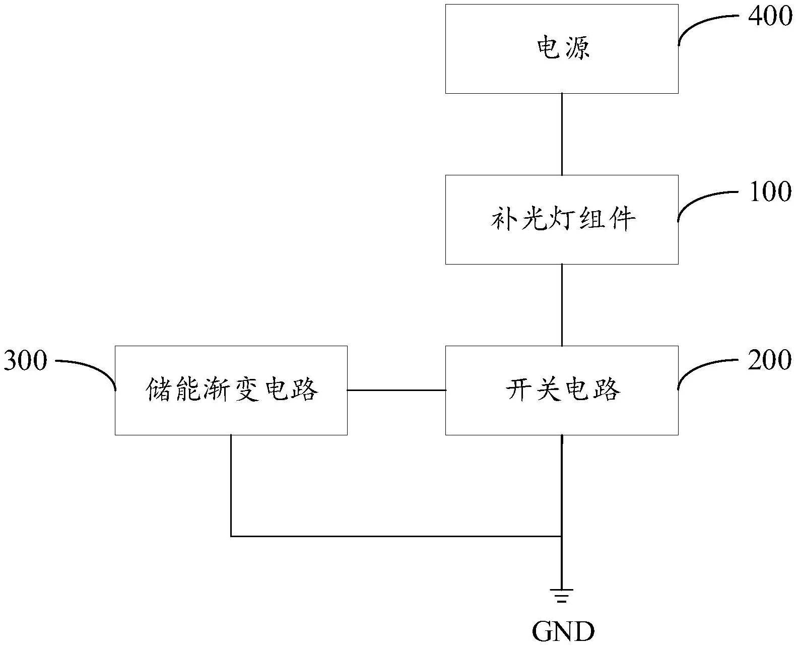 本申请实施例提供一种补光灯电路及楼宇对讲机,涉及灯光控制技术领域。该补光灯电路包括开关电路、补光灯组件和储能渐变电路;所述补光灯组件包括多个补光灯,所述多个补光灯并联,所述补光灯组件的第一端连接电源,所述补光灯的第二端连接所述开关电路;所述储能渐变电路包括储能电容,所述储能电容的第一端连接所述开关电路的输入端,所述储能电容的第二端接地。该补光灯电路可以实现补光灯渐亮和渐灭,提高用户体验;且电路结构简单,可实现节省成本和空间的技术效果。