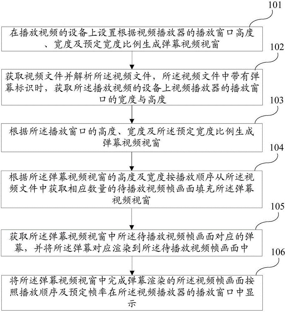 本发明公开预加载播放弹幕的方法,包括:在播放视频的设备上设置根据视频播放器的播放窗口高度、宽度及预定宽度比例生成弹幕视频视窗;获取带有弹幕标识的视频文件时,根据播放窗口的高度、宽度及预定宽度比例生成弹幕视频视窗;根据弹幕视频视窗的高度及宽度按播放顺序从视频文件中获取相应数量的待播放视频帧画面填充弹幕视频视窗;获取弹幕视频视窗中待播放视频帧画面对应的弹幕,并将弹幕对应渲染到待播放视频帧画面中;将弹幕视频视窗中完成弹幕渲染的视频帧画面按播放顺序及预定帧率在视频播放器的播放窗口中显示。本发明提高了弹幕播放的效率。