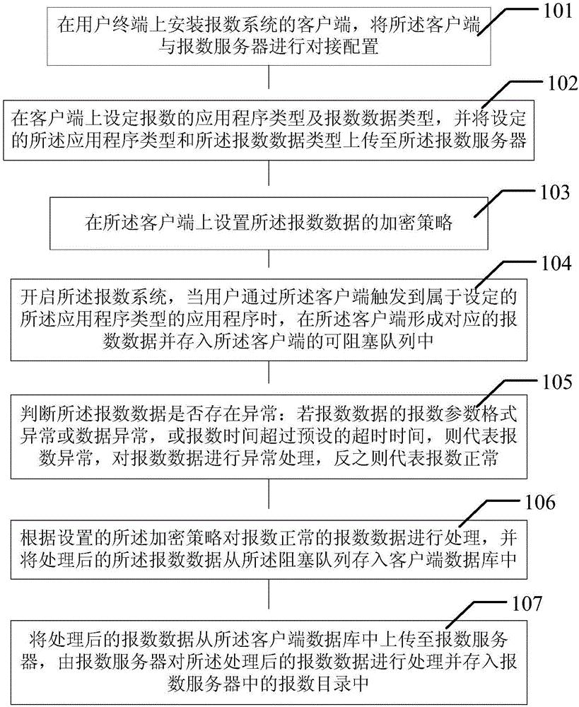 本申请公开报数系统的报数异常处理方法及报数系统,方法包括:在用户终端上安装报数系统的客户端,将客户端与报数服务器进行对接;设定报数的应用程序类型及报数数据类型;设置报数数据的加密策略;开启报数系统,当触发到属于设定的应用程序类型的应用程序时,形成对应的报数数据并存入客户端的可阻塞队列中;判断报数数据是否存在异常:若报数数据的报数参数格式异常或数据异常,或报数时间超过预设的超时时间,则代表报数异常,对报数数据进行异常处理,反之则代表报数正常;根据设置的加密策略对报数正常的报数数据进行处理,并将处理后的报数数据从阻塞队列存入客户端数据库中;将处理后的报数数据从客户端数据库中上传至报数服务器。