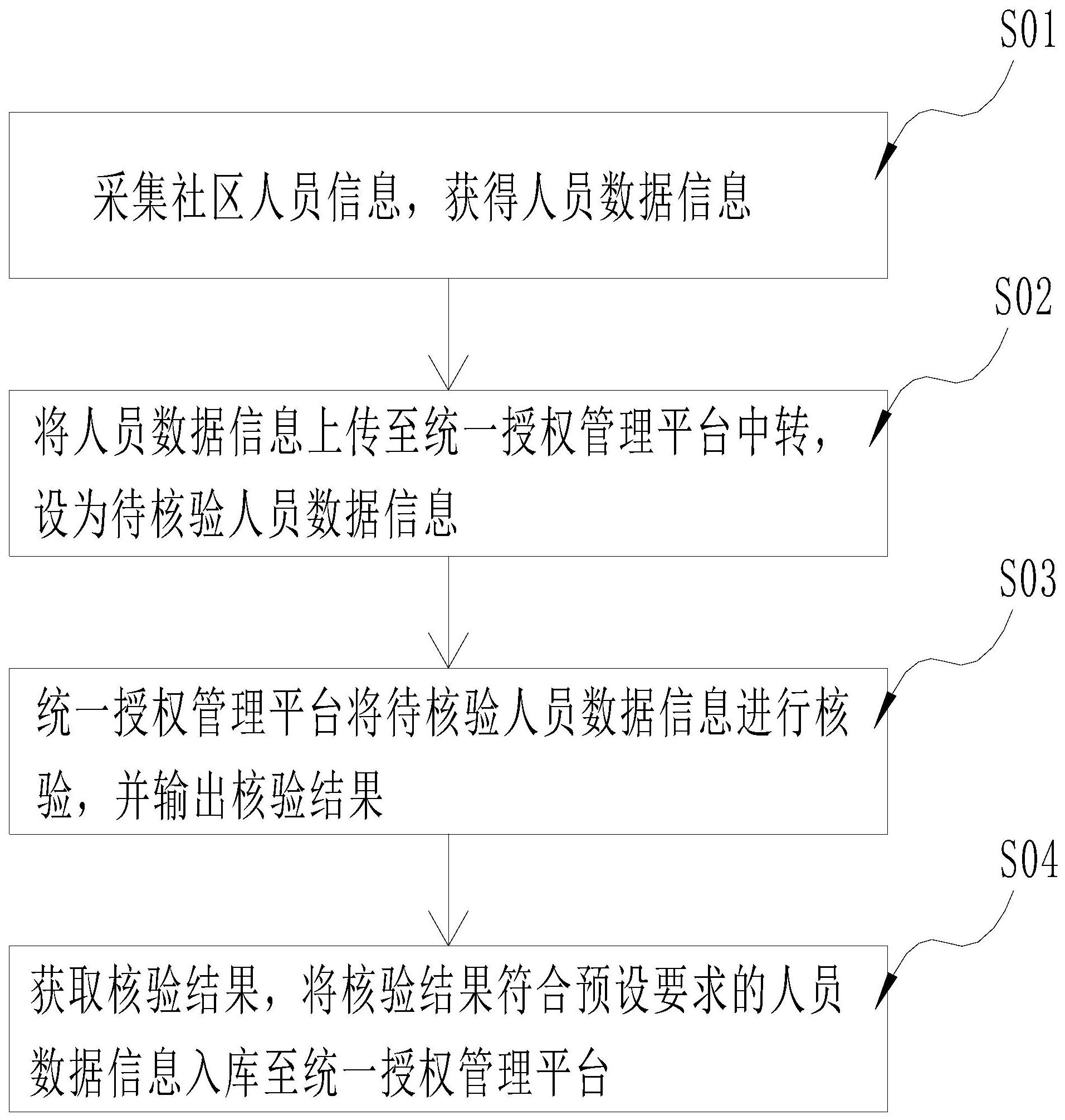 本发明公开了一种社区人员信息采集方法及系统和应用,方法包括:S01、采集社区人员信息,获得人员数据信息;S02、将人员数据信息上传至统一授权管理平台中转,设为待核验人员数据信息;S03、统一授权管理平台将待核验人员数据信息进行核验,并输出核验结果;S04、获取核验结果,将核验结果符合预设要求的人员数据信息入库至统一授权管理平台,本方案实施可靠、操作便利且数据管理规范、成本低,其所构建形成的统一授权管理平台可以作为门禁系统的匹配库或其他应用领域的匹配库进行人员匹配和验证,大大提高了人员数据信息的全面型和准确性,提高了社区管理的安全性。