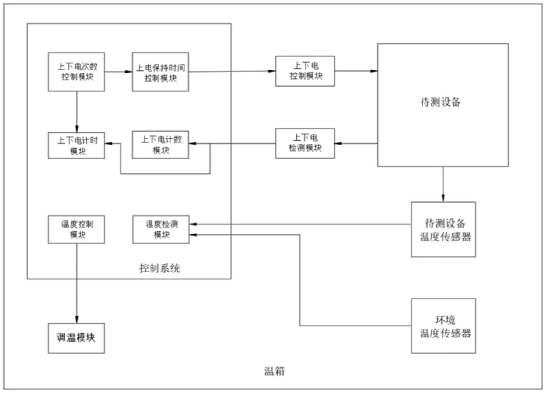 本实用新型涉及一种模拟测试温度环境的上下电老化测试系统,包括:上下电控制模块,用于连接至待测设备;上下电检测模块,用于连接至待测设备,检测所述待测设备的上下电情况;调温模块,用于调节待测设备的周围环境至目标温度;控制系统,集成或被配置有:上下电次数控制模块,用于发出预设次数的上电信号至所述上下电控制模块,使所述上下电控制模块控制所述待测设备上下电预设次数;上下电计数模块,连接至所述上下电检测模块,用于计数所述待测设备的上下电次数;上下电计时模块,连接至所述上下电次数控制模块和所述上下电检测模块,用于计时所述待测设备的上电时间和/或下电时间。