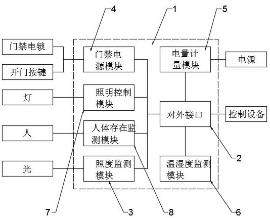 本实用新型涉及一种多功能控制模块计量监测装置,属于控制模块集成及工程施工安装技术领域,包括壳体、对外接口、照度监测模块、门禁电源模块、电量计量模块、温湿度监测模块和照明控制模块;所述对外接口通过有线通讯与外部控制设备相连,所述对外接口通过有线通讯或无线通讯与照度监测模块、温湿度监测模块、照明控制模块和人体存在监测模块相连。本实用新型解决了目前B201项目对独立办公空间内的设备覆盖率还不够高的问题,满足了实际的使用需求;可以通过线扎绑定进线,外接到其他束线位置的方式,使产品外接线方向平行于产品安装方向,方便拆装。