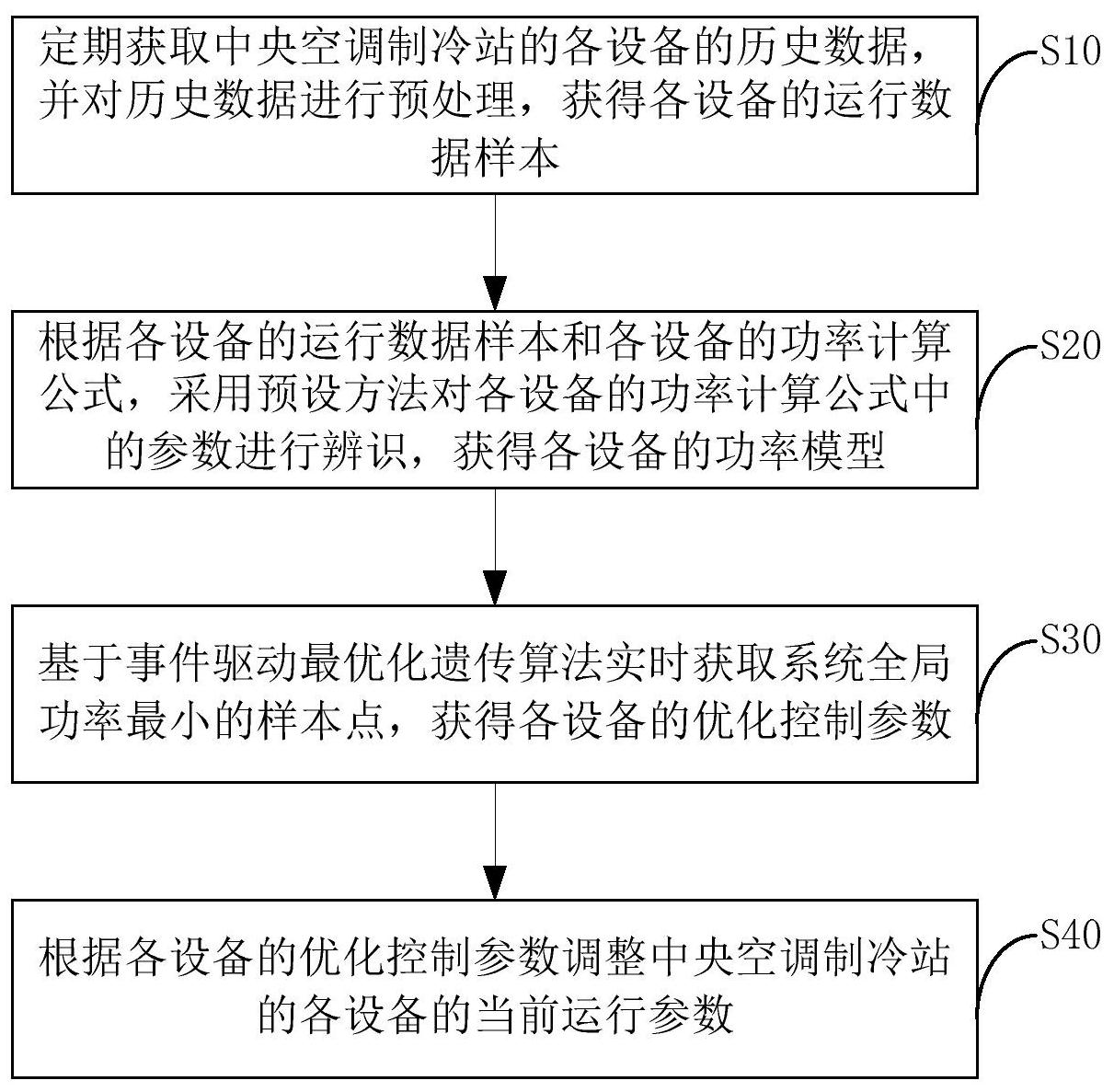 本发明涉及中央空调制冷站全局优化节能控制方法、系统和电子设备,包括:定期获取中央空调制冷站的各设备的历史数据,并对历史数据进行预处理,获得各设备的运行数据样本;根据各设备的运行数据样本和各设备的功率计算公式,采用预设方法对各设备的功率计算公式中的参数进行辨识,获得各设备的功率模型;基于事件驱动最优化遗传算法实时获取系统全局功率最小的样本点,获得各设备的优化控制参数;根据各设备的优化控制参数调整中央空调制冷站的各设备的当前运行参数。本发明智能化的实现了对中央空调制冷站全局优化节能控制,同时基于事件触发驱动优化计算避免全局优化计算时间长、优化参数多、高频次调节的缺点,减少系统频繁操作的投入成本。
