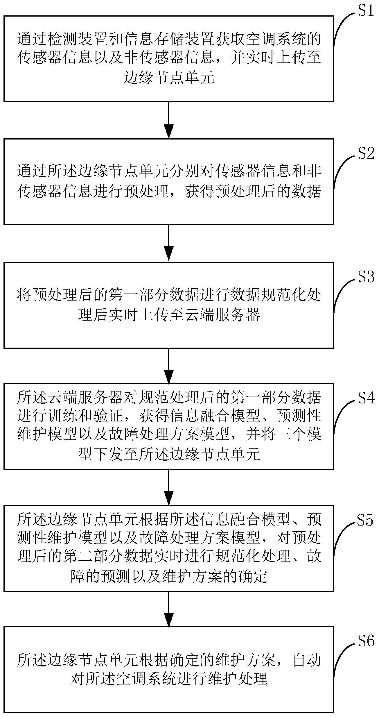 本发明公开了一种地铁站空调预测性运维管理方法及系统,该方法包括以下步骤:通过检测装置和信息存储装置获取空调系统的传感器信息以及非传感器信息,并实时上传至边缘节点单元;通过边缘节点单元分别对传感器信息和非传感器信息进行预处理,获得预处理后的数据;将预处理后的第一部分数据进行数据规范化处理;云端服务器对规范处理后的第一部分数据进行训练和验证,获得信息融合模型、预测性维护模型以及故障处理方案模型;边缘节点单元根据信息融合模型、预测性维护模型以及故障处理方案模型,对预处理后的第二部分数据实时进行规范化处理、故障的预测以及维护方案的确定;边缘节点单元根据确定的维护方案,自动对空调系统进行维护处理。