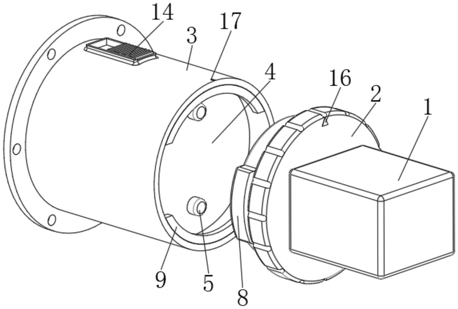 本实用新型公开了一种便于安装的数据采集装置,包括数据采集器、连接插头和固定管,所述连接插头与数据采集器固定安装,所述固定管的内壁滑动安装有移动盘,所述移动盘的外表面固定安装有移动插头。本实用新型通过将连接插头插入至固定管内,使连接插头与移动插头相抵,将移动盘向固定管的内部推动,在卡块完全插入至固定管的内部后,转动连接插头,在连接插头的插孔转动至移动插头处后,移动盘将在压缩弹簧的弹力作用下推动移动插头插入至连接插头的插孔内,使移动插头通过连接插头与数据采集器相接通,并且移动插头能够对连接插头进行限位,使连接插头无法再转动,从而实现对连接插头的紧固安装。