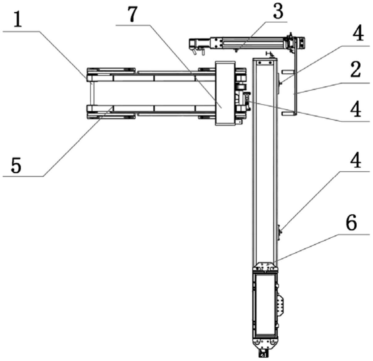 本实用新型涉及一种传送装置,具体的说是一种能够实现产品自不同生产工序自动、连续、稳定的传送衔接的用于物品表面缺陷检测的物料传送装置,所述中转机构中设有料叉、料叉升降机构、料叉底座、直线滑台,所述料叉升降机构固定在料叉下方,料叉升降机构下端与料叉底座固定连接,料叉底座与直线滑台的螺母座固定连接,所述料叉底座上还设有侧立板,侧立板对应料叉运动最低点和最高点分别设有位置传感器,与现有技术相比,能够满足薄板状待检测物料的多检测工序的连续检测,多组传送机构与中转机构衔接流畅,结构合理、占空间小,可显著提高工作效率。