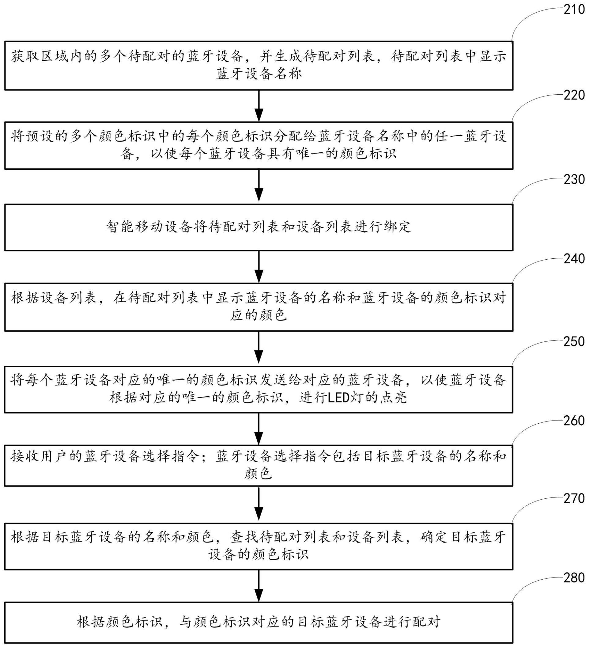 本发明提供了一种设备查询方法,包括:智能移动设备获取区域内的多个待配对的蓝牙设备,并生成待配对列表;将预设的多个颜色标识中的每个颜色标识分配给蓝牙设备名称中的任一蓝牙设备,以使每个蓝牙设备具有唯一的颜色标识;将待配对列表和设备列表进行绑定;根据设备列表,在待配对列表中显示蓝牙设备的名称和蓝牙设备的颜色标识对应的颜色;将每个蓝牙设备对应的唯一的颜色标识发送给对应的蓝牙设备,以使蓝牙设备根据对应的唯一的颜色标识,进行LED灯的点亮;接收用户的蓝牙设备选择指令;根据目标蓝牙设备的名称和颜色,查找待配对列表和设备列表,确定目标蓝牙设备的颜色标识,根据颜色标识,与颜色标识对应的目标蓝牙设备进行配对。