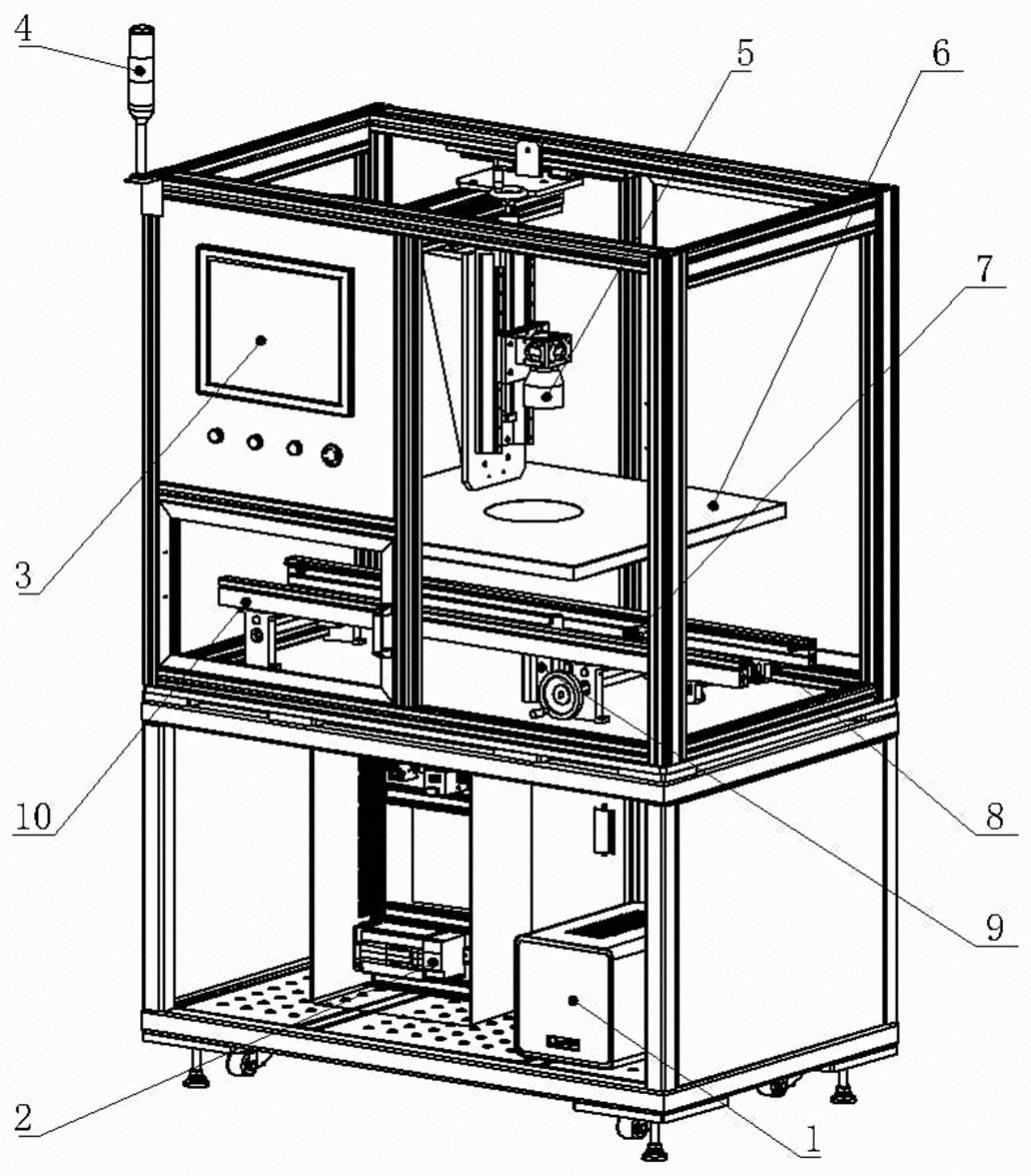 本实用新型涉及电路板检修设备技术领域,具体的说是一种插件式器件插装后视觉检测装置,其特征在于,所述操作平台上设有水平设置的物料传送机构,物料传送机构上设有待检测物品固定板,所述物料传送机构上方设有沿水平方向设置的光源固定板,光源固定板中央开设圆形通孔,光源固定板的下侧设有光源,光源固定板的上方设有摄像组件,摄像组件包括摄像头和升降机构,所述升降机构包括侧立板和固定在侧立板上竖直设置的直线滑台组件,所述摄像头固定在直线滑台组件上,所述摄像头位于光源固定板的圆形通孔正上方,所述侧立板和光源固定板均与机架固定连接,与现有技术相比,具有结构紧凑、占空间小、操作简便、检测效率高等显著的优点。