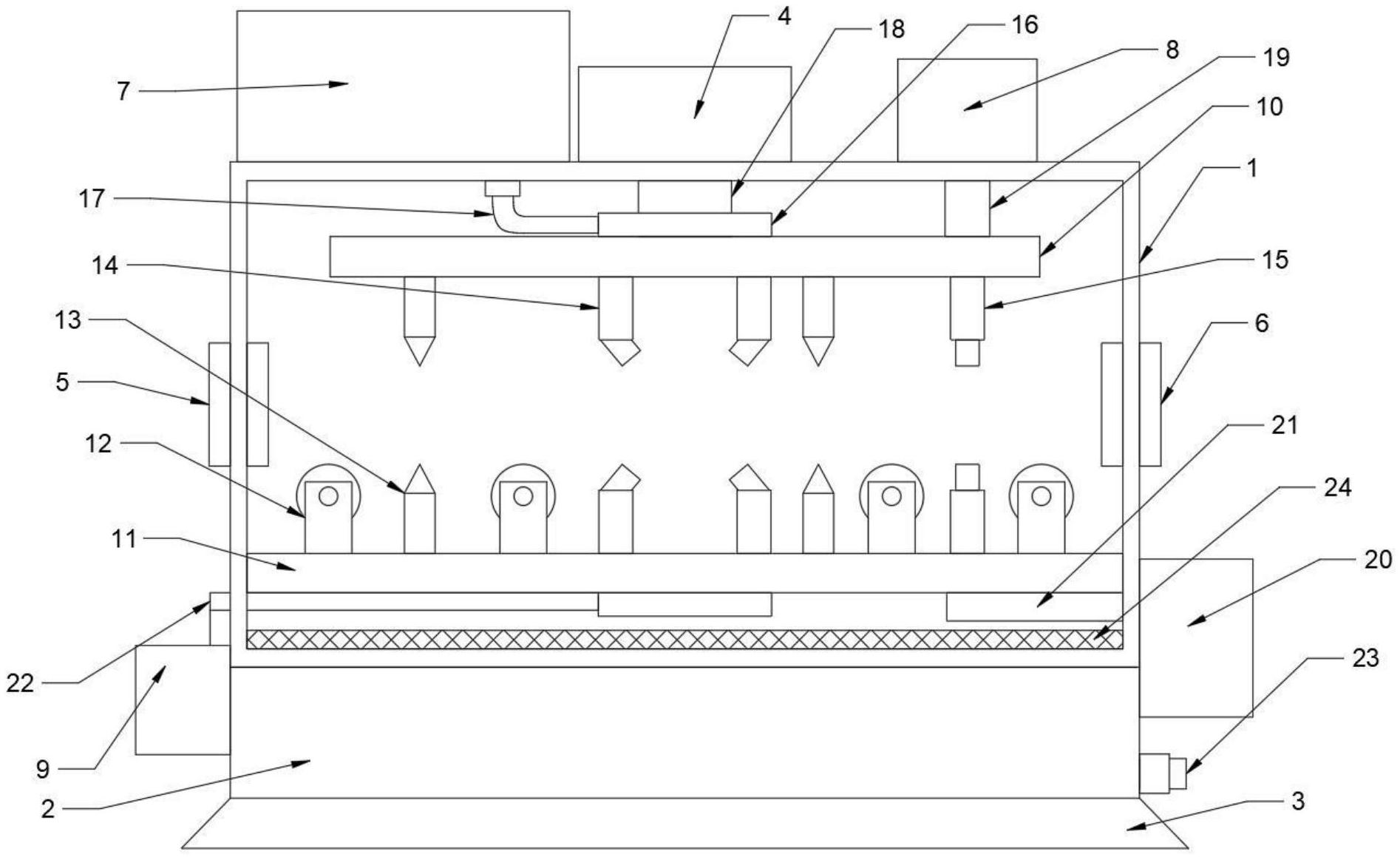 本实用新型提供一种新型防火玻璃生产用清洁装置,包括支撑架和第一水箱,第一水箱为长方体结构,且其底部设置有底座,第一水箱一侧底部设置有泄水管,支撑架设置在第一水箱顶部,第一水箱顶部顶部为开启状态且其顶部设置有滤网,支撑架一侧设置有进料口,且在支撑架另一侧设置有出料口,进料口与出料口相对应,安装板底部均与安装架对应设置有刮板、喷头和排风管,支撑架顶部设置有第一鼓风机,第一鼓风机底部输出端设置有出风伸缩管,出风伸缩管输出端与安装板底部的排风管相连通。本实用新型使得使用者对防火玻璃在生产过程中进行清洁变得更加方便和高效,在保证防火玻璃的表面清洁的同时,且可以对不同尺寸和厚度的防火玻璃进行清洁处理。
