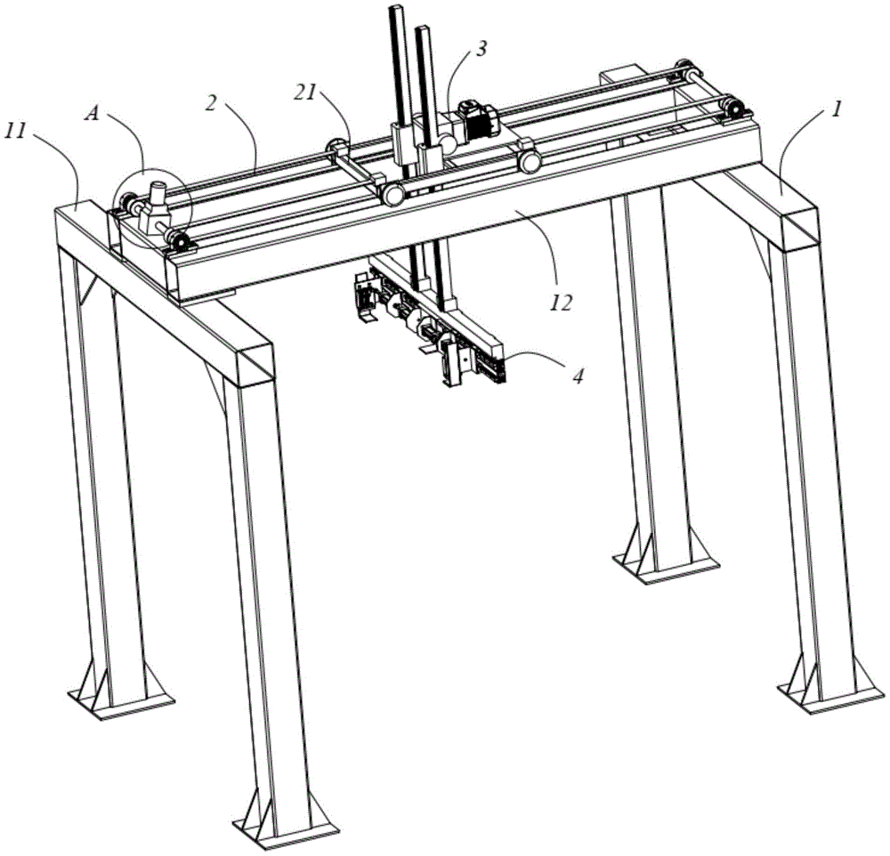 本实用新型涉及一种龙门式抓取升降结构,包括龙门式机架、位于龙门式机架上的X轴移动模块、位于X轴移动模块上的Z轴升降模块、设置于Z轴升降模块上的抓取模块,所述的抓取模块包括设置于Z轴升降模块上的抓取固定板、设置于抓取固定板上的设置抓手装置;所述的抓手装置由侧面活动抓手组件以及端面活动抓手组件组成并从物品的三个方向抓取,所述的侧面活动抓手组件设置在抓取固定板一侧,两个所述的端面活动抓手组件设置于抓取固定板的两端。采用上述结构之后,实现对地板的抓取的同时不会对地板造成损伤,不再需要人工进行堆叠,可以实现24小时持续使用,减少了人工,降低了成本,实现了抓取的自动化,为地板制作过程全自动化提供基础。