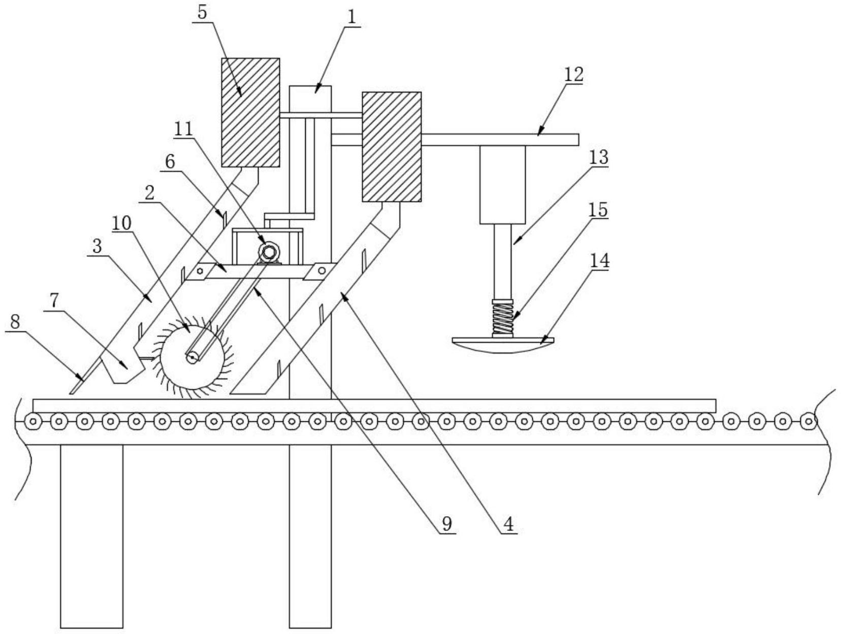 本实用新型公开了一种全钢防静电活动地板用自动贴面除尘机,包括安装有若干传送辊的输送机,所述输送机一侧设置有机架,所述机架一侧设置有除尘机构,所述除尘机构包括横杆,所述横杆一端固定连接有第一吸附管,所述横杆另一端固定连接有第二吸附管,所述第一吸附管和第二吸附管均为倾斜设置,所述第一吸附管和第二吸附管顶端分别接通有吸尘器。本实用新型结构简单,使用方便,通过第二吸附管可以先行将地板表面的灰尘及喷塑粉料吸走,滚轴带动刷毛将喷塑层表面凸出的粉末扫脱离,此时杂质再经第一吸附管吸附,可以有效的对地板表面进行除尘。