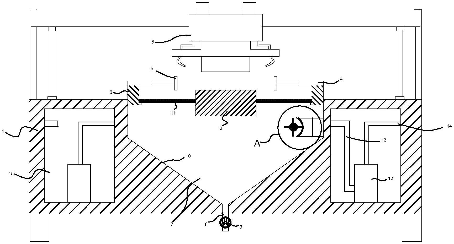 本实用新型提出一种结构简单、方便污水二次收集的一种用于人造石打磨除尘设备的水循环装置,包括机架,所述机架上设有用于放置石材板的工作台,所述工作台上设有用于夹持固定石材的夹持固定装置,所述工作台上方设有用于给石材打磨且在打磨时候能够喷水的喷水打磨装置,所述机架位于工作台下方开设有集水槽使打磨后的水直接流入集水槽内,所述机架上开设有用于给喷水打磨装置提供水源的储水室,所述储水室与集水槽之间设有用于将集水槽内水抽取至储水室的抽水装置。