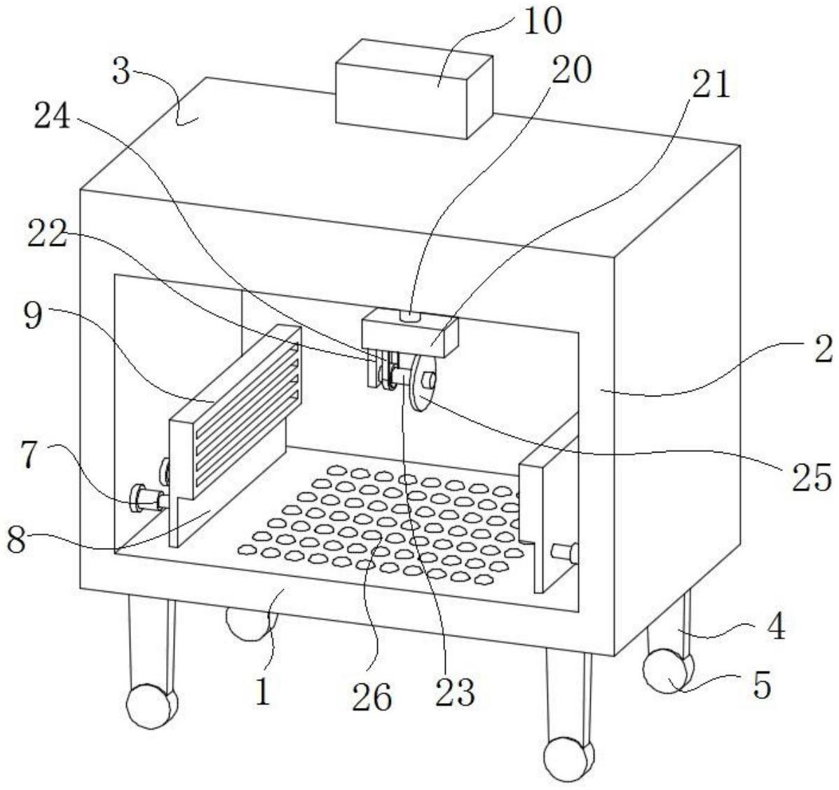本实用新型公开了一种防尘耐污生态板的切割装置,涉及切割设备技术领域。本实用新型包括工作台、支撑板、顶板、控制器和电机箱,工作台上表面两侧均焊接有支撑板,支撑板一表面安装有控制器,两支撑板上表面焊接有顶板,顶板上表面安装有电机箱,顶板下表面设置有滑槽,工作台下表面焊接有若干支撑柱,若干支撑柱一端均通过螺栓固定有滑轮。本实用新型通过电机箱和螺纹杆结构,方便切割轮按照设定的速率进行切割,无需人为造作,提高了切割过程的安全系数,通过第一电动伸缩杆和夹紧块结构,方便自动夹紧板材,提高切割时的稳定性,降低工人劳动力,通过吸尘器结构,避免在切割板材的过程中产生的碎屑发生飞扬的情况,方便后期的回收和清理。