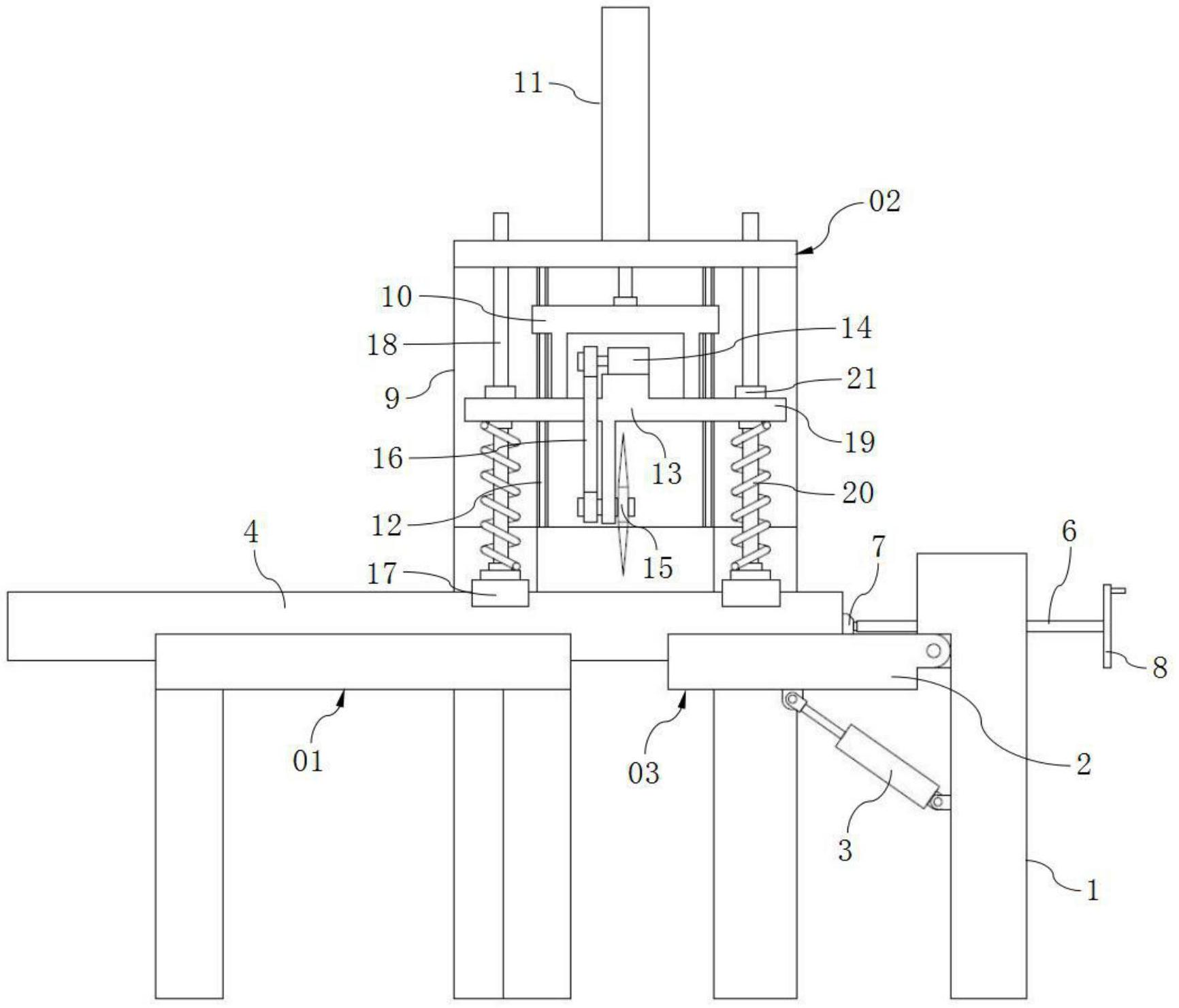 本实用新型提供一种木材的快速切割装置,包括支撑装置、切割装置和下料装置,所述支撑装置与下料装置之间留有间隙,切割装置位于所述间隙的上方并能够沿竖直方向移动,所述下料装置包括支架、支撑板和气缸,所述支撑板的一端铰接于支架相对于支撑装置的一侧,支撑板与支撑装置之间留有所述间隙,所述气缸的一端铰接于支撑板的下表面,气缸的另一端铰接于支架上,木材能够从支撑装置上运送至支撑板上。本实用新型能够实现自动化的切割、下料作业,提高工作效率。