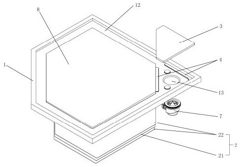 本实用新型公开了一种淋浴房加热底盆,包括底座本体和加热装置,所述底座本体的上、下端面分别设有排水槽、安装腔,排水槽在底座本体上端面对应沿安装腔的外缘位置进行设置、且其底部设有一排水孔,所述加热装置安装于安装腔内端,其中加热装置包括加热板、防水加固层,所述防水加固层分别设置于加热板上下两端面上;本实用新型的加热装置可对安装腔进行加热使得站立台面发热,使人体足部不易受凉;其防水加固层分别设置于加热板的上下两端面上,提高加热板的防潮性。