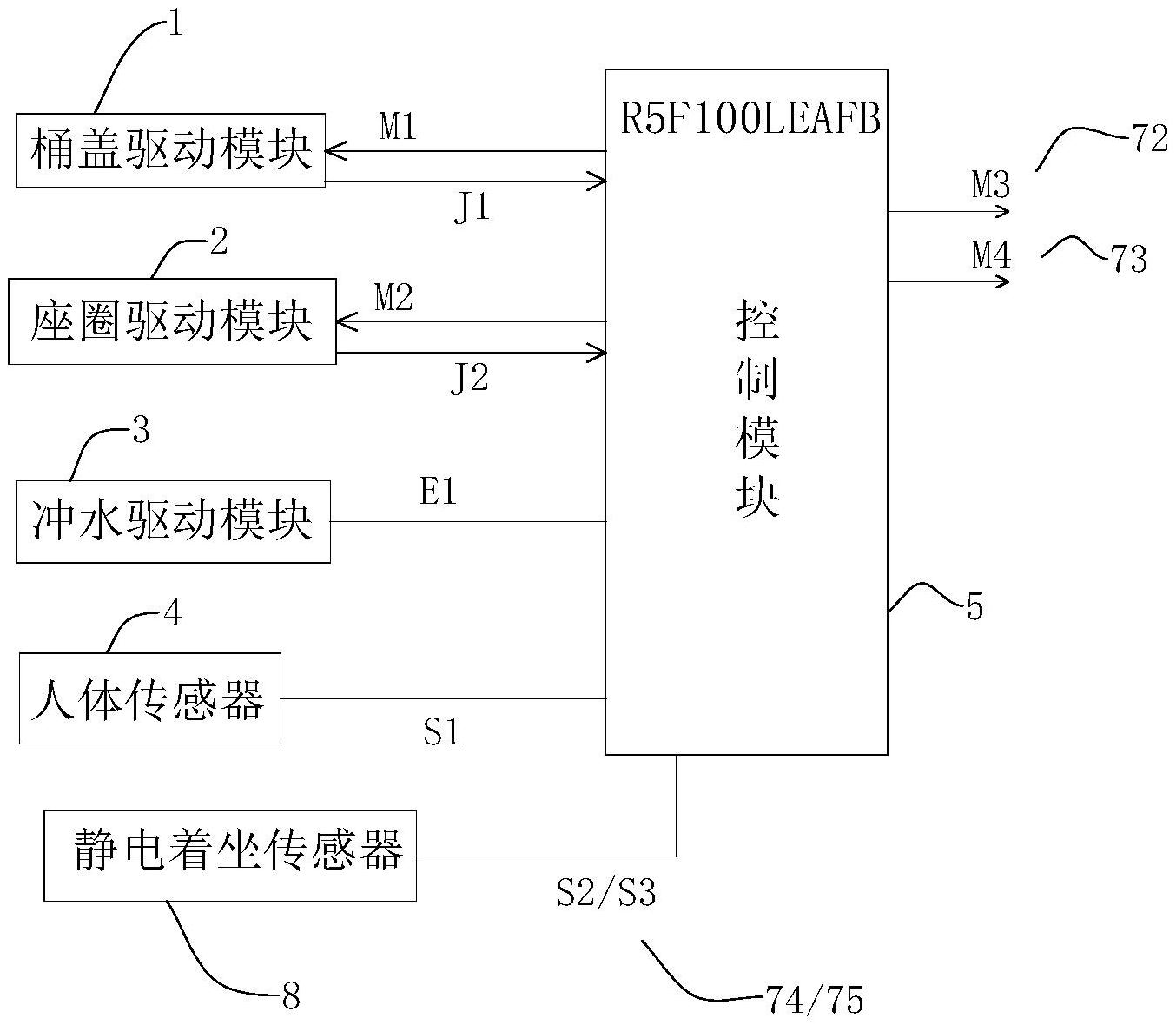 本实用新型公开了一种智能马桶控制器,属于卫浴设备技术领域,解决了如何提高智能马桶的控制能力,在卫生方面进一步优化的问题,其技术方案要点是包括桶盖驱动模块、座圈驱动模块、冲水驱动模块、人体传感器,还包括控制模块,桶盖驱动模块、座圈驱动模块、冲水驱动模块、人体传感器分别连接于控制模块,当人体靠近,人体传感器输出感应信号给控制模块,控制模块控制桶盖驱动模块、座圈驱动模块进行打开操作,桶盖驱动模块、座圈驱动模块分别反馈各自的角度信号给控制模块,控制模块接收到角度信号后发送便器预湿信号和裙边预湿信号,达到了便于使用卫生的效果。