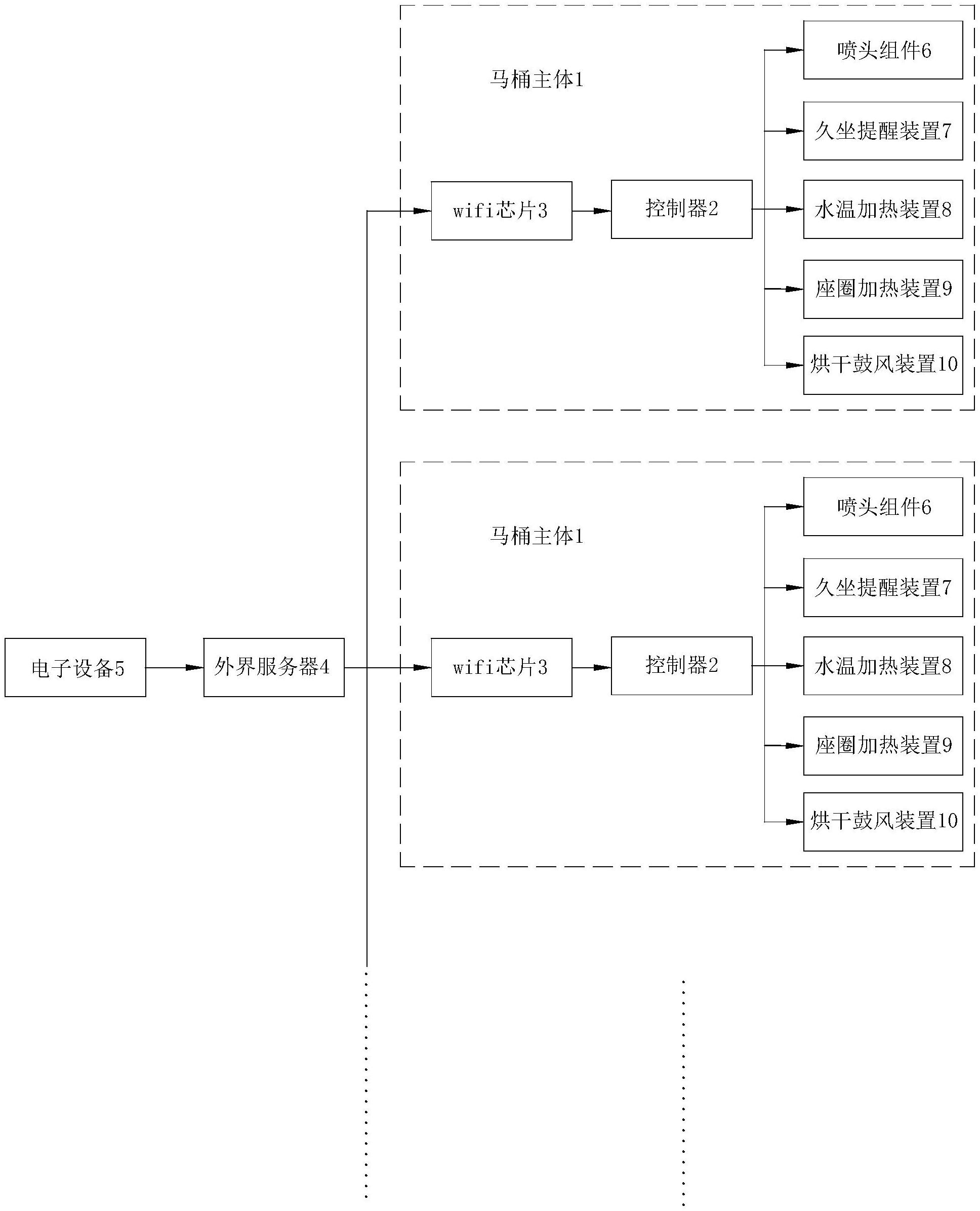 本实用新型属于智能马桶技术领域,特指一种智能马桶的控制装置,包括有若干个马桶主体,马桶主体上设有功能执行装置,每一所述马桶主体上均设有控制器、以及与控制器电性连接的wifi芯片,wifi芯片通过wifi与外界服务器无线通讯连接,外界服务器与电子设备无线通讯连接,由外界服务器根据电子设备的信号通过wifi与对应wifi芯片通讯传输、并由对应控制器根据外界服务器的信号控制功能执行装置的工作状态。本实用新型通过将多个马桶主体与外界服务器数据连通,使得用户能够借助电子设备在外界服务器上分别对每个马桶主体进行功能调节,以有效提高智能马桶的使用便利。
