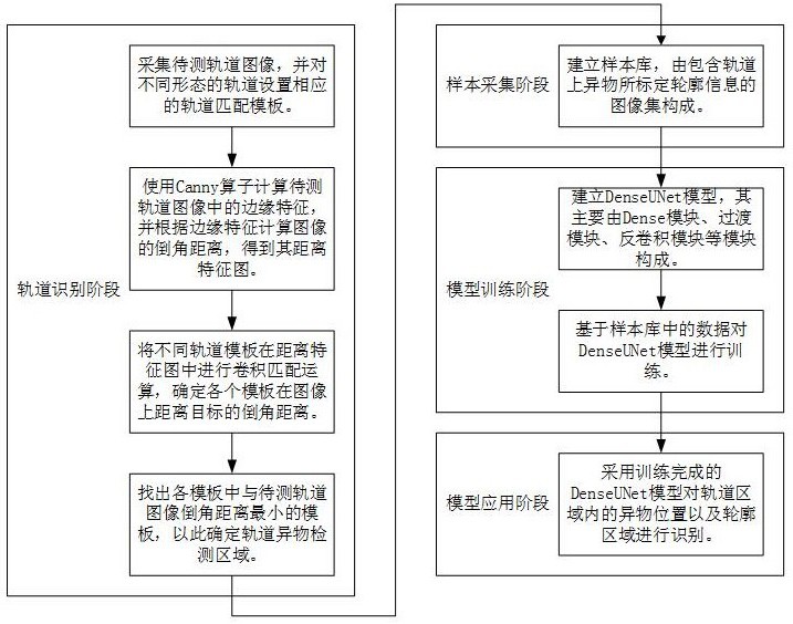 一种基于图像的轨道异物探测方法,采集待测轨道图像,对不同形态的轨道设置相应的轨道匹配模板;使用Canny算子计算待测轨道图像中的边缘特征,并根据边缘特征计算图像的倒角距离,得到其距离特征图;将不同轨道模板在距离特征图中进行卷积匹配运算,以确定各个模板在图像上距离目标的倒角距离,倒角距离越小则表示模板在该位置的匹配值越高;找出各模板中与待测轨道图像倒角距离最小的模板,以此确定轨道异物检测区域;建立样本库,由包含轨道上异物所标定轮廓信息的图像集构成;建立DenseUNet模型,其主要由Dense模块、过渡模块、反卷积模块模块构成;基于样本库中的数据对DenseUNet模型进行训练,采用训练完成的DenseUNet模型对轨道区域内的异物位置以及轮廓区域进行识别。