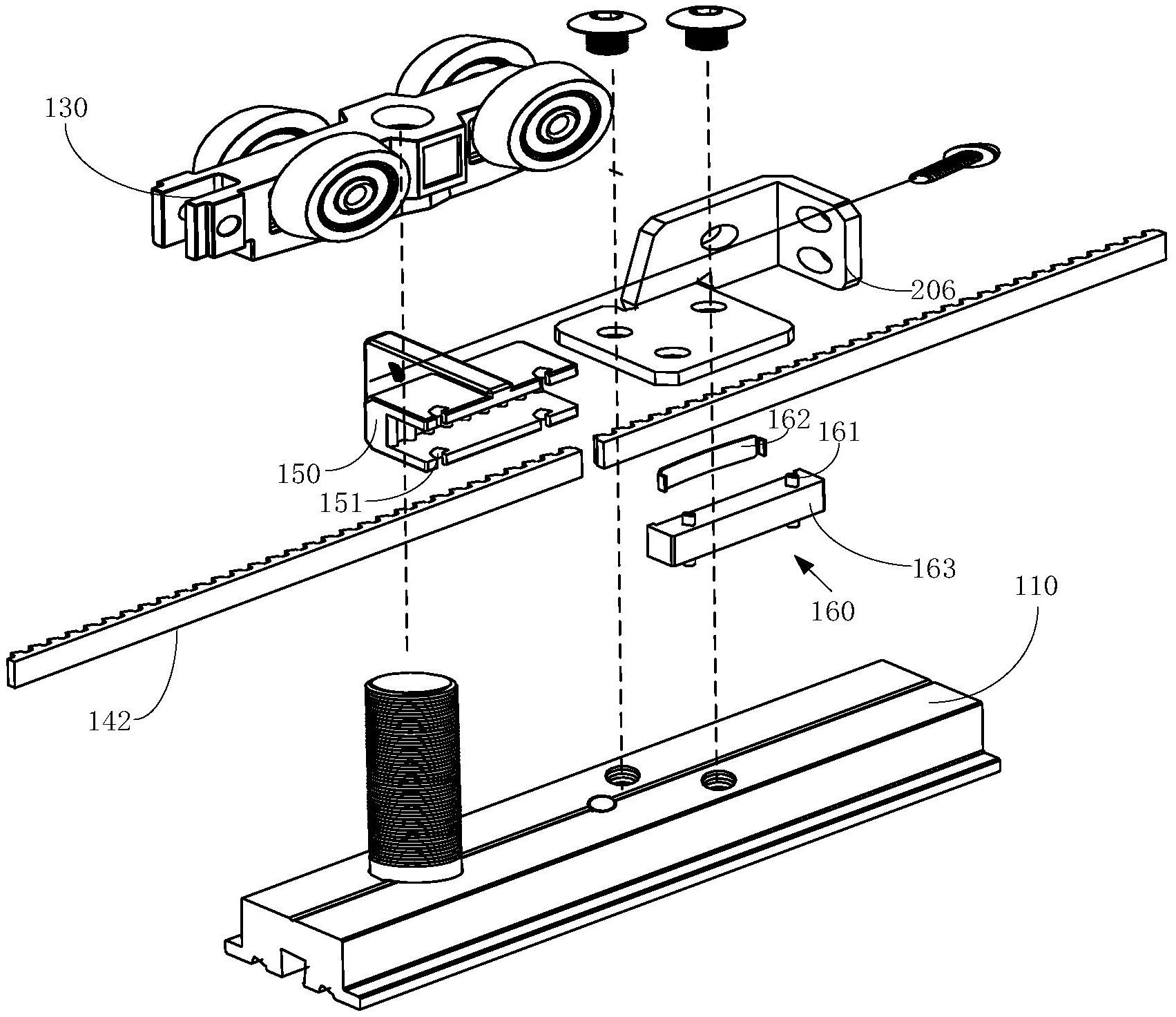 本实用新型涉及一种同步反向联动推拉门结构与推拉门。包括:轨道,移动件,同步带组件,包括沿长度方向间隔设置的两个同步带轮,以及套设于两个同步带轮的同步带;固定组件,包括第一固定件与第二固定件,同步带被夹设于第一固定件与第二固定件之间,第一固定件与第二固定件二者之中,其中一者设有限位柱,另一者设有具有开口的限位槽,限位槽包括限位段与进出段,限位段与进出段的延伸方向不同,限位柱能够经进出段滑动至限位段。由于进出段和限位段延伸方向不同,故限位柱不会从限位槽里脱出,所以安装十分快捷方便,拆卸维修时只需要将限位柱推向进出段,通过进出段将第一固定件和第二固定件分开,即可完成拆卸。