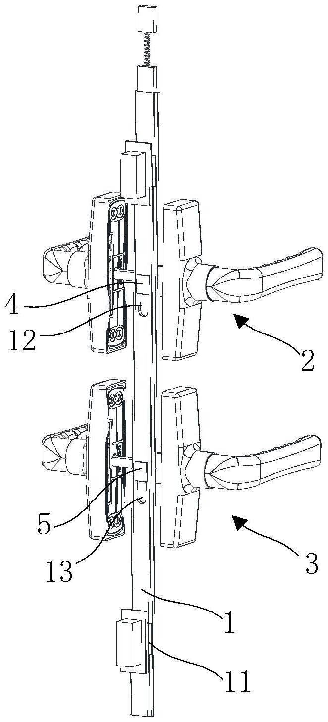 本实用新型涉及一种双执手联动锁体,包括传动连杆、上下设置的第一、第二执手组件、第一、第二传动销及第一、第二传动组件,传动连杆安装有锁块和上、下布置的第一、第二连接槽。第一、第二传动销分别滑动配合于第一、第二连接槽,第一传动组件传动连接于第一执手组件与第一传动销之间,第一执手组件可通过第一传动组件驱动第一传动销上下运动,第二传动组件运动过程同理。该锁体,通过上下设置执手组件满足了不同的高度需求。操作第一执手组件使第一传动组件驱动第一传动销在第一连接槽中上下运动,操作第二执手组件同理,实现传动销带动传动连杆向上,锁块避开锁舌。设置连接槽使执手组件能独立操作,满足成人及幼童均能自行便捷的启闭平开门。