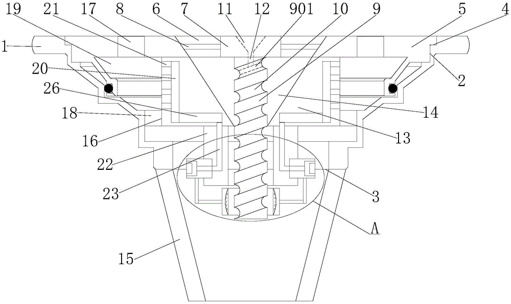 一种增压式快速排水的地漏,包括本体、设于本体上表面中心的进水孔以及设于本体下表面中心的出水孔,进水孔与出水孔相贯通,进水孔上端孔口内壁设有卡位台阶,卡位台阶上设有与其相匹配的盖板,所述盖板中心设有一与进水孔相贯通的排水孔;所述排水孔内设有一固定块;所述固定块通过若干呈圆周均匀分布的连杆与排水孔内壁相连接;所述固定块下表面中心设有一引水柱;所述引水柱外壁上设有一呈螺旋状的引水槽;所述固定块上表面中心设有一分流孔;所述引水柱上端内设有一与引水槽相贯通的放水孔。本实用新型的增压式快速排水的地漏能够有效增加排水速度,保证在最短时间内将地面的污水排入到排水管道系统内。