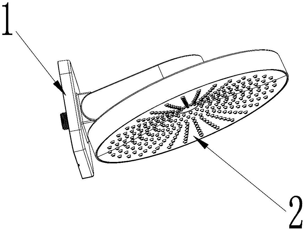 本实用新型提供了一种淋浴装置,包括:基座、顶喷花洒和摆动构件;所述基座用于安装在外部墙体中;所述顶喷花洒对接在所述基座;所述摆动构件包含可转动地配置在基座上的摆体件、插接在摆体件上的连接件;所述摆体件与基座相活动接合,所述连接件与顶喷花洒相联动;其中,所述基座凸起设有一轴线部,所述摆体件设有与所述轴线部相适配的配合部,以允许所述配合部能够绕轴线部相对活动,从而可操作地带动顶喷花洒择一适于用户淋浴使用的预定摆动角度。从而允许配合部能够绕轴线部相对活动,进而带动顶喷花洒摆动角度,轴线部形成在基座上并构造成利于摆体件活动的基准,使得两者之间配合更为紧密、且稳定性更佳。
