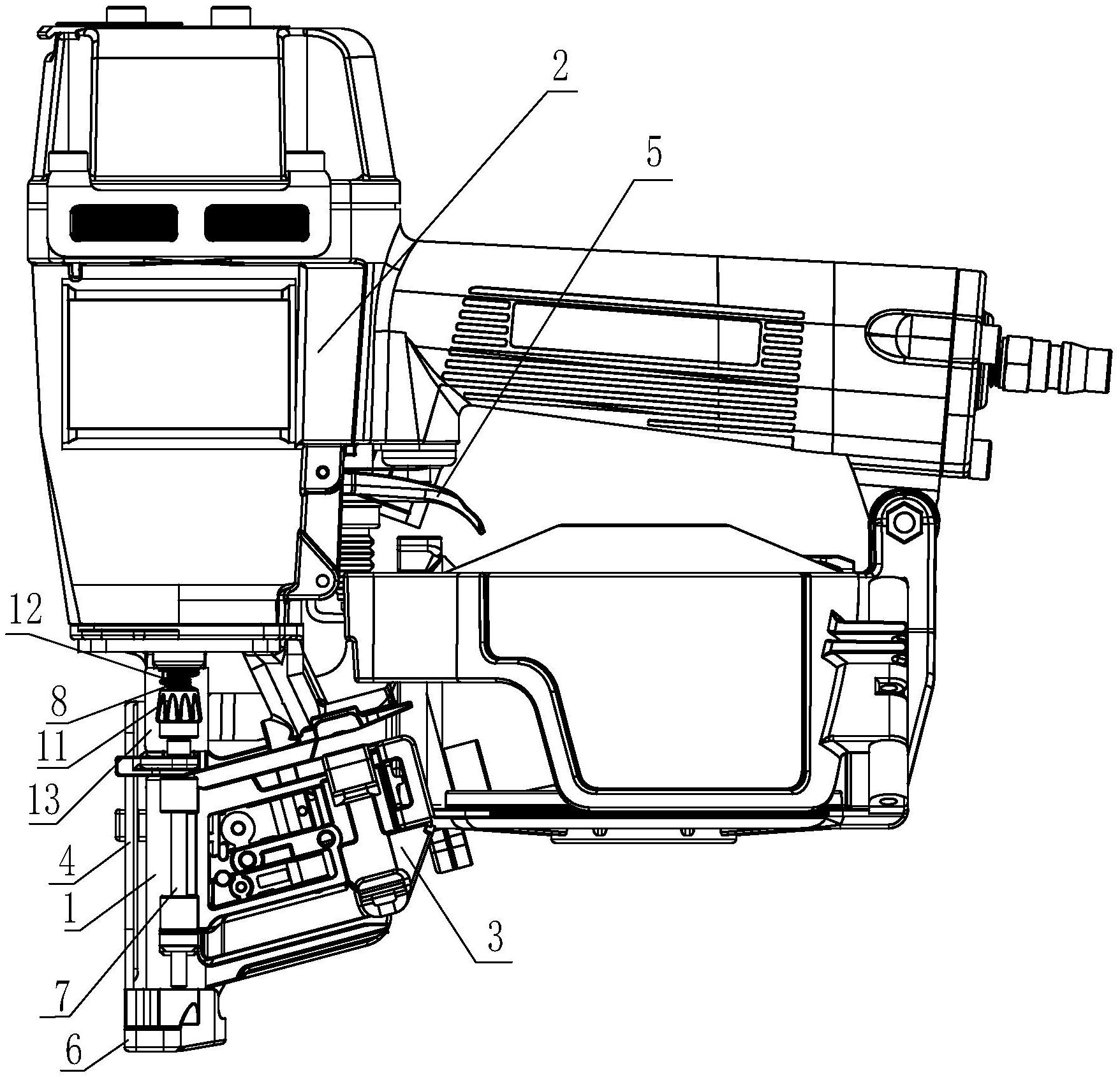 本实用新型公开了一种可调节打钉深度的气钉枪,包括枪头、枪身、弹夹装置、设置于枪头上的保险架、调节机构和扳机装置,调节机构包括定位销和调节螺杆,所述调节螺杆位于定位销上端部,调节螺杆底部抵触于定位销上端部上,所述调节螺杆包括杆部和头部,所述杆部固定有调节轮,调节轮和枪身之间设有压簧,压簧环套于杆部上,所述枪头上设有与调节轮相对应的限位座,所述限位座上具有向调节轮方向延伸的条形凸起,所述调节轮外壁均匀分布有多个与条形凸起相适配的条形凹槽,所述条形凸起卡于条形凹槽内。该气钉枪能够防止调节螺杆在使用过程中发生位移,能够准确控制枪口与保险架之间距离,防止使用过程中因调节螺杆转动而造成打钉深度发生偏移。