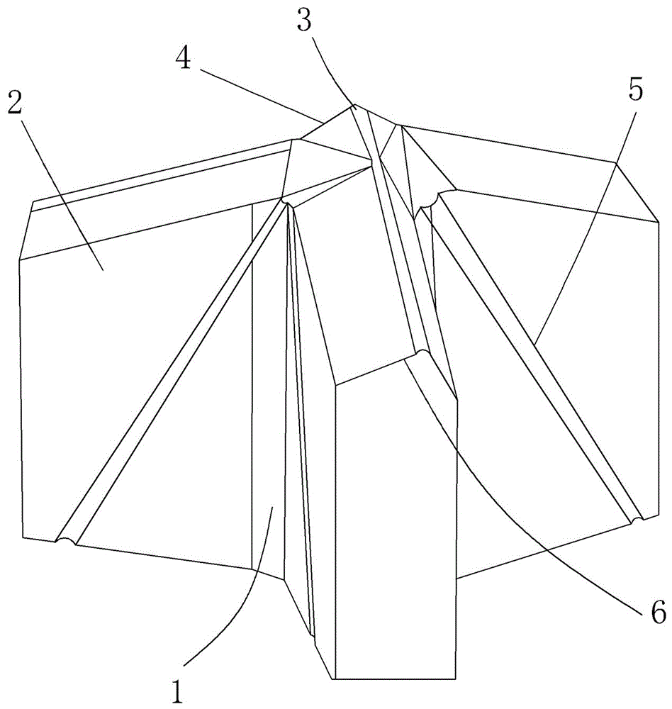 本实用新型公开了一种Y字形冲击钻头,包括钻芯,在钻芯的侧面一体成型有三个冲击钻片,三个冲击钻片与钻芯组成Y字形结构,在钻芯的端部固定有钻尖,在钻尖与冲击钻片的端部之间设置有倾斜导引筋板,在冲击钻片的侧面上开设有用于导引制冷液的导液倾斜槽,在冲击钻片的顶面为倾斜设置且一体成型有三角形凸起,且三角形凸起的外端角为弧形设置。本实用新型的结构设置合理,其设置有三个冲击钻片,从而可以提高冲击的范围,同时在冲击钻片的侧面设置有导液倾斜槽,从当有制冷液时,也可以从导液倾斜槽直接导引至钻尖,有利于对钻尘进行散热,从而提高使用的寿命,同时其设置有倾斜导引筋板,也可以保证钻尖的使用稳定可靠性,适用性强且实用性好。