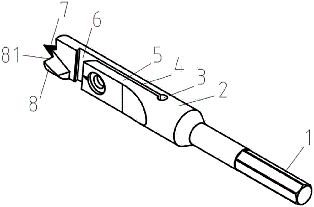 本实用新型的木工钻,钻杆前端的锥形钻尖能够准确定位,钻杆位置精度高;钻尖根部设置第一切削刃,可直接完成小直径钻孔工作,通过狭长槽夹装不同长度的刀具,刀具还能够在狭长槽内沿径向滑动并定位,能够根据需要调节钻孔直径,完成不同直径钻孔工作,结构简单紧凑,操作方便,提高了工作效率,排屑槽对蓬松木质屑容屑空间大,易排屑、易散热,延长了钻杆的使用寿命,节约了工具成本成本投入。