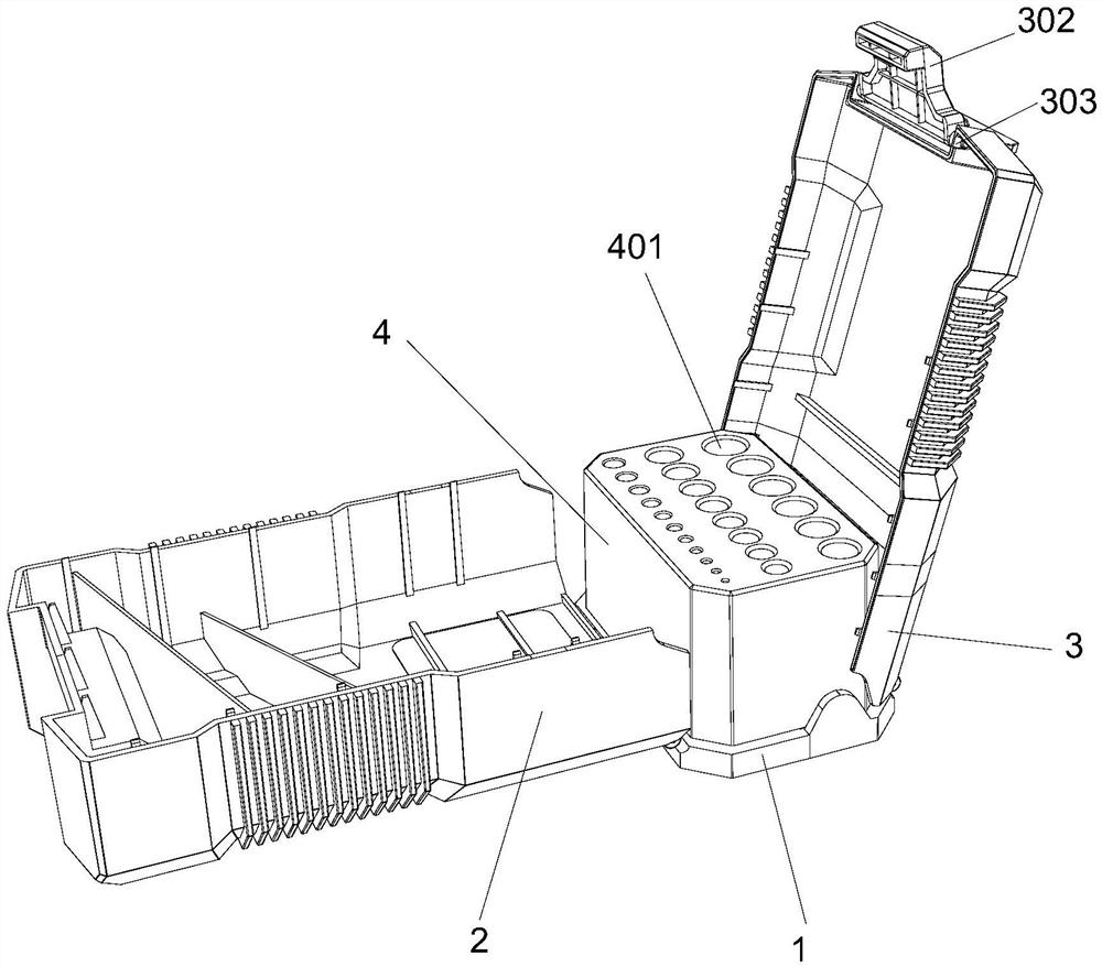 本实用新型公开了一种新型钻头收纳盒,属于钻头收纳盒技术领域。一种新型钻头收纳盒,包括底座,底座上部左侧设有第一壳体,第一壳体右侧设有第二壳体,底座上部顶面设有收纳体,底座左右两侧对称设有四个连接体A,底座顶面设有凸台,凸台四边中部固定连接有连接板,连接板外侧位于底座表面开设有卡槽,底座上部前后两侧对称设有两个限位板,限位板与第一壳体及第二壳体接触,本实用新型通过锁扣将第一壳体与第二壳体顶部连接,且通过在第二壳体与锁扣连接处开设导入槽,便于锁紧块及锁扣的安装,通过连接体C下侧中部设置限位块B,使第二壳体只能打开到如图所示角度,这样在实用中可以有效避免人为误操作导致钻头翻滚,滑落。