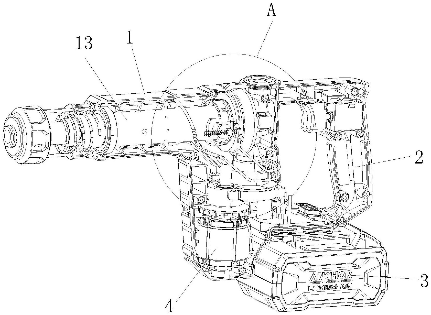 本实用新型涉及电动工具技术领域,且公开了一种电锤拨叉工作状态调整结构及电锤,包括机壳,所述机壳的内部设有驱动电机,驱动电机的输出端固定安装有连接台,连接台的顶面固定安装有主动齿轮,通过驱动电机带动主动齿轮自由转动,所述机壳的内部固定安装有固定座,所述固定座上转动安装有联动齿轮,主动齿轮和联动齿轮啮合连接,所述联动齿轮的顶面固定安装有转台,转台的顶面固定安装有锥形齿轮,所述锥形齿轮上固定安装有偏心轮,偏心轮上固定安装有连杆,所述机壳的内部转动安装有伞状齿圈。本实用新型中,连接环与卡扣环相脱离后,通过连杆带动冲击子做单一的前后往复运动,达到了方便控制冲击子运动状态的效果。