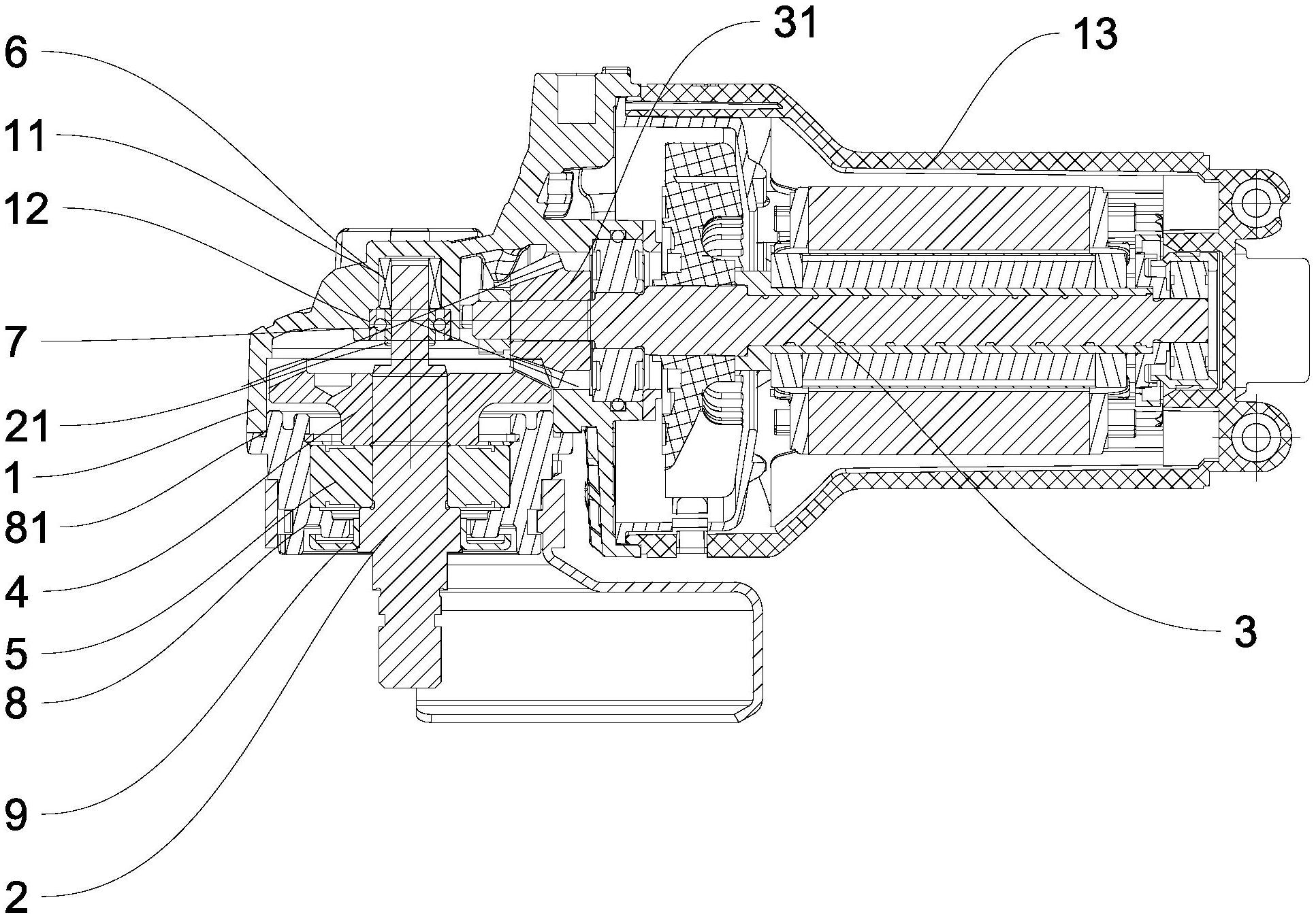 本实用新型涉及角磨机领域,涉及一种角磨机的主轴结构,本实用新型包括:齿轮箱、主轴和驱动组件,所述主轴设置于齿轮箱内部,所述主轴中部设有前轴承,所述主轴上设有大齿轮且位于前轴承上端,所述驱动组件设置于齿轮箱右侧并与大齿轮传动连接,所述主轴上端位于齿轮箱的腔体一内,所述腔体一下端连通有腔体二,所述主轴顶部设有滚针轴承,所述滚针轴承设于腔体一内,所述主轴上设有位于滚针轴承下端的球轴承,所述球轴承位于腔体二内,所述主轴上设有环形限位部,所述环形限位部设置于球轴承下端,通过滚针轴承以及下端的球轴承进行配合使用,解决了单一滚针轴承使用间隙较大的问题,既能减少振动,又能满足载荷力,在发热上也能改善。