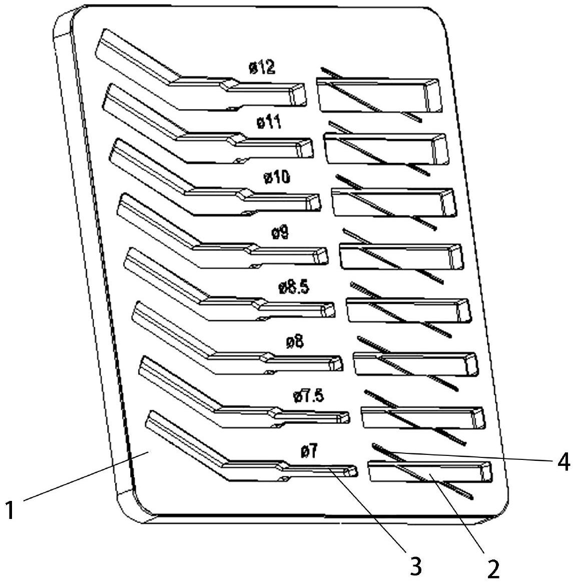 本实用新型提供一种检测模板,包括:模板本体;检测部,其设置在所述模板本体上,所述检测部具有检测腔室;其中,当所述待测物能够置入所述检测腔室,并能够相对其顺利滑动至位于所述检测腔室内的目标位置时,表征所述待测物能够被物料输送装置中的指定输送管道顺利输送,所述指定输送管道的尺寸规格及外形与所述检测腔室的尺寸规格及外形对应匹配,所述指定输送管道的尺寸规格为能够顺利输送所述待测物的最小尺寸规格。本实用新型的检测模板,用于快速准确地确定出能够顺利输送待测物的最小输送管道尺寸。