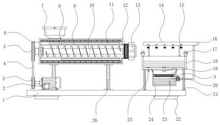 本实用新型公开了一种软管快速挤出机,具体涉及软管制造技术领域,包括底板,所述底板底端的四个拐角处分别固定连接有底座。本实用新型通过在冷却槽底端的中间位置处设置有净化机构,对挤出成型后的软管进行冷却后的水体通过固定连接在冷却槽底端的下水口进入固定连接在冷却槽底端的净化箱的内部,通过设置在净化箱内部的滤网对水体进行过滤净化处理,同时启动固定连接在净化箱一侧底部的水泵通过抽水管将净化后的水抽出,并通过输水管再次送入送水管的内部,如此循环提高了水资源的利用率,同时可通过卡块和卡槽之间构成的卡合结构达到了可对滤网进行拆卸以便于清理和更换的目的,从而有效的降低了生产成本,且环保性更佳。