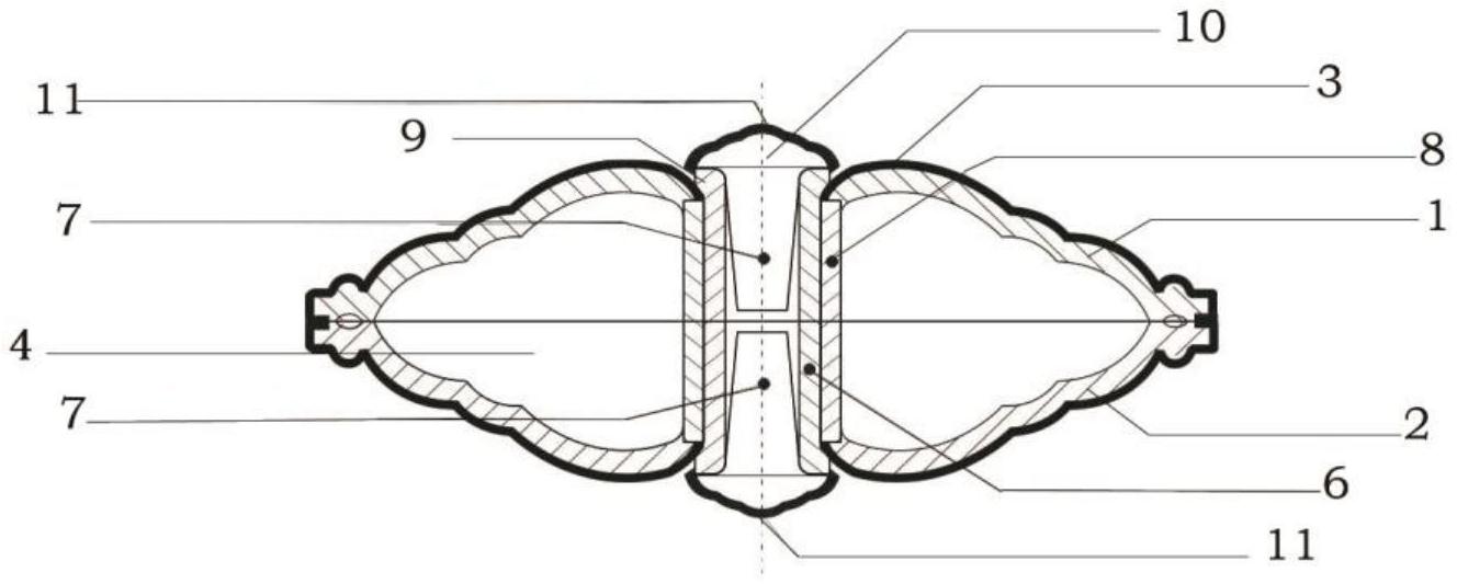 本实用新型公开了一种银包金空心首饰,银包金空心首饰包括表面附有黄金层的上、下银质基层,黄金层边缘向内翻边;上银质基层、下银质基层对扣形成空腔;上银质基层和下银质基层上都具有通孔;外银管安装在所述空腔内并位于上银质基层的通孔和下银质基层的通孔之间,外银管内安装有内银管,内银管的两端具有向外的翻边;两个带有黄金盖的银铆钉分别从两端插入内银管中使银铆钉的钉帽封闭内银管两端。制备该银包金空心首饰时,先制作两个零件,然后再对扣在空腔最高处铆接。本实用新型制作的两面银包金空心首饰表面黄金层质量高,黄金层含量99.9%以上,制作工艺环保,满足民族饰品的需求。
